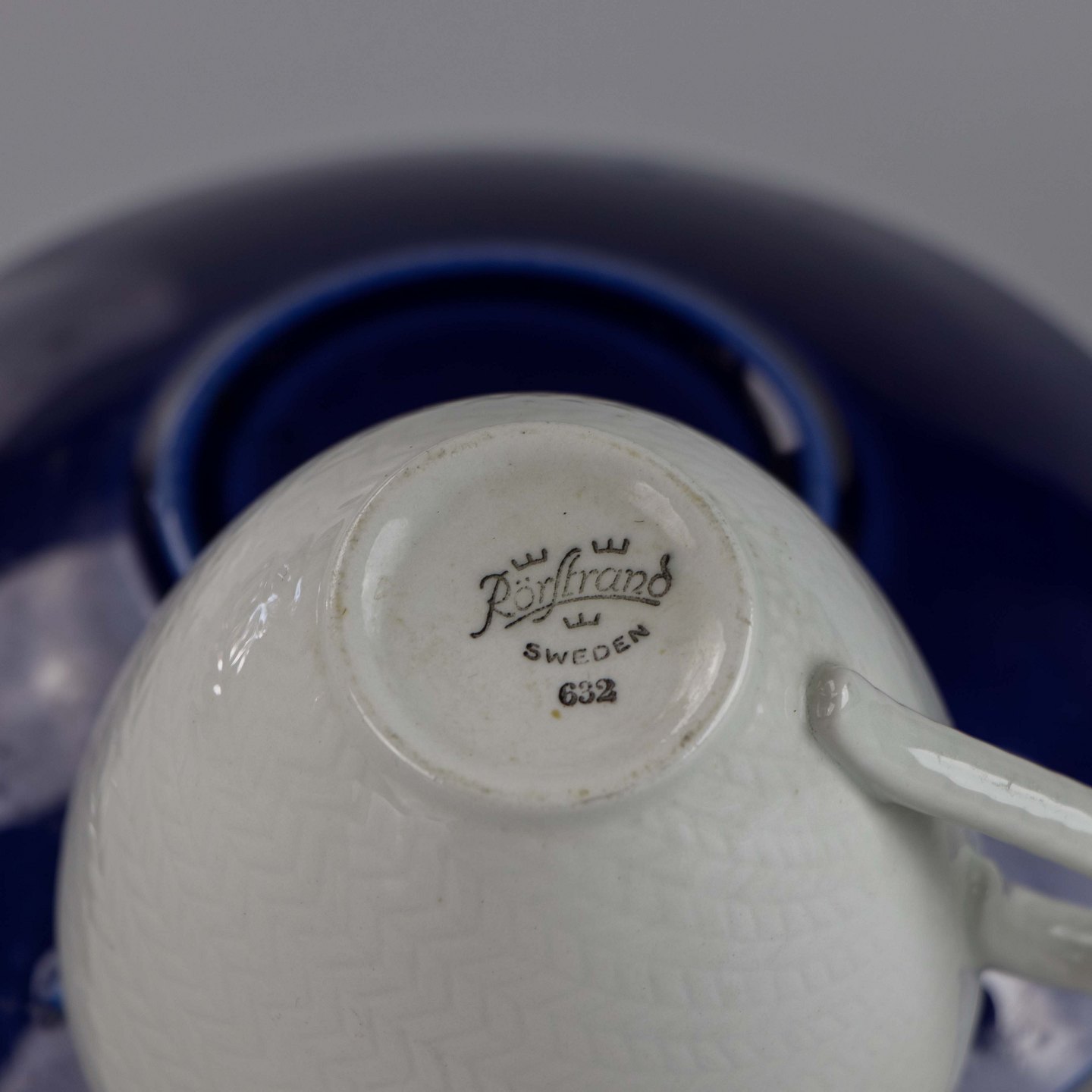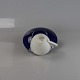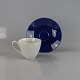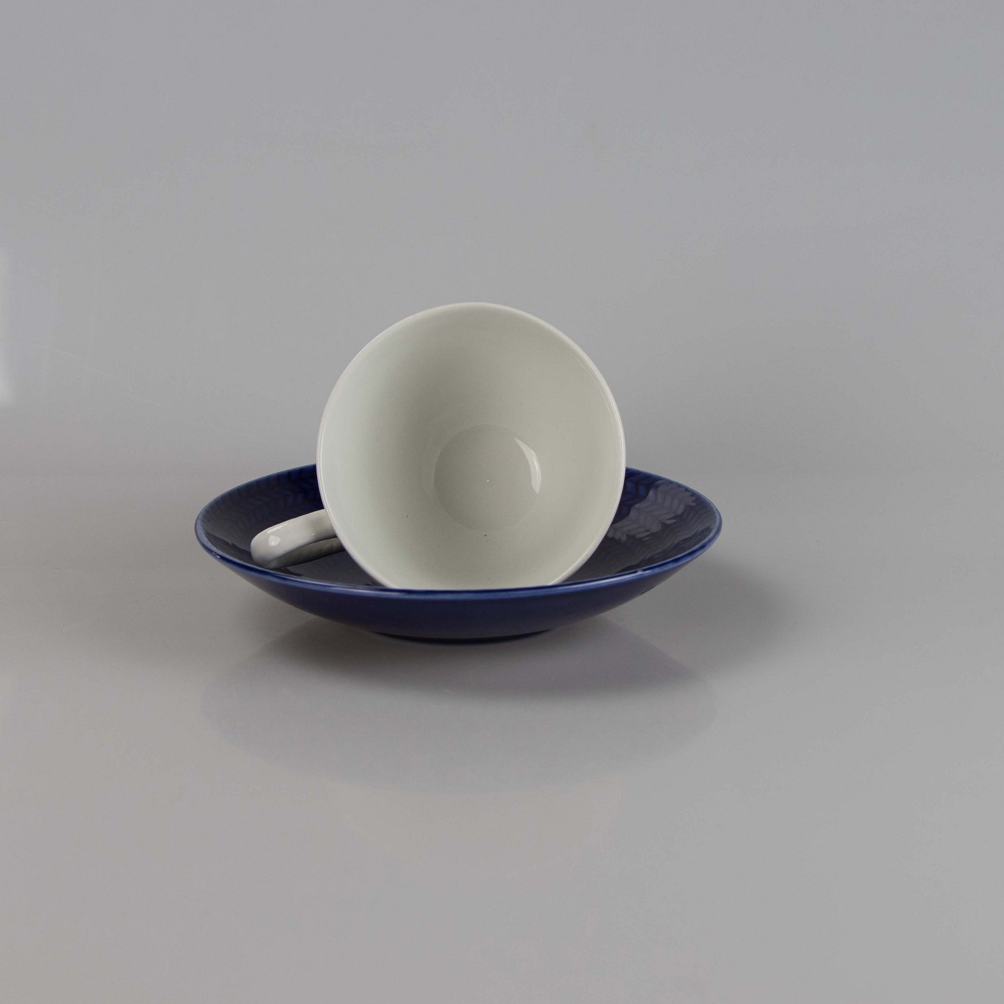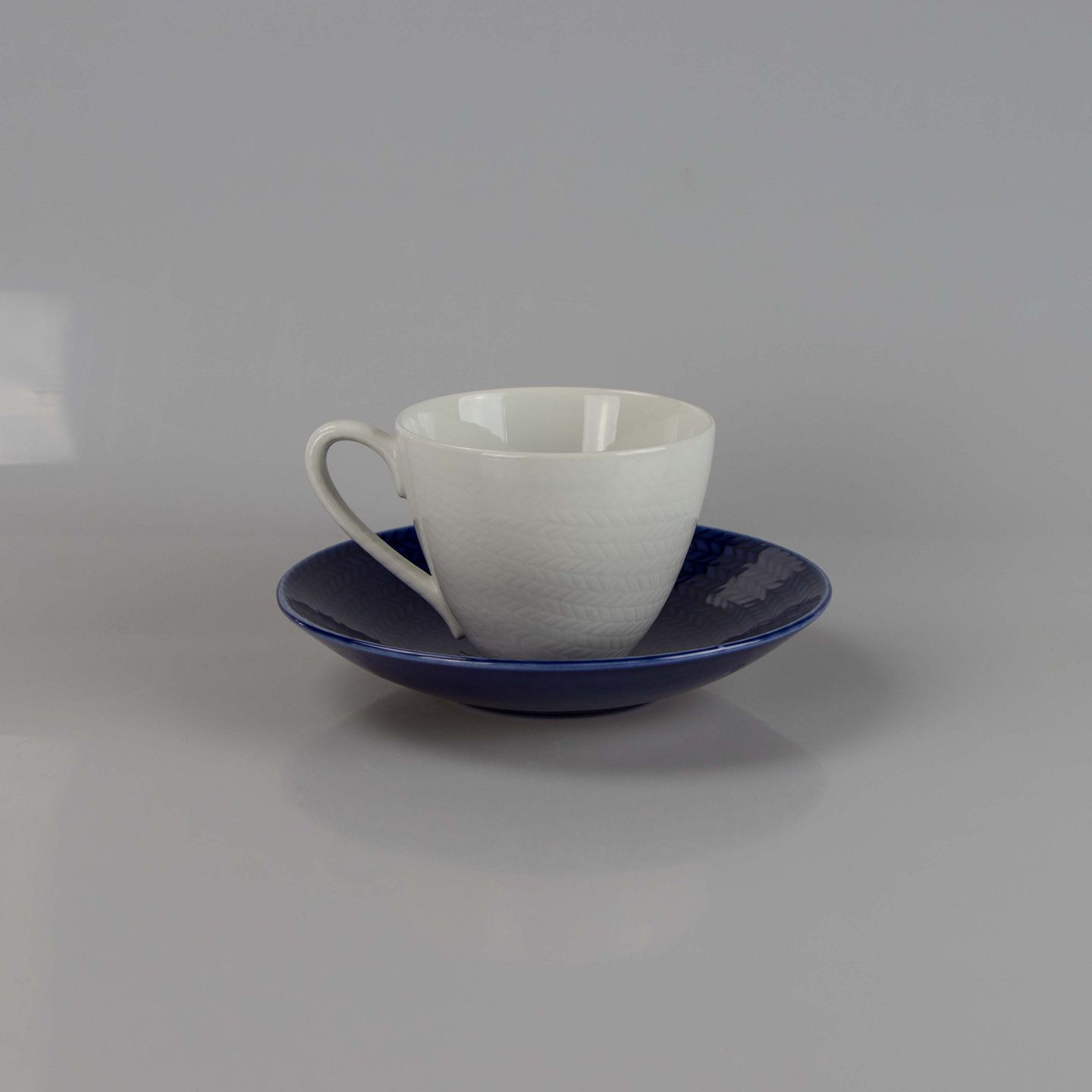 Kop og underkop fremstillet i i hvid og blå fajance med indstøbt sildebensmønster.