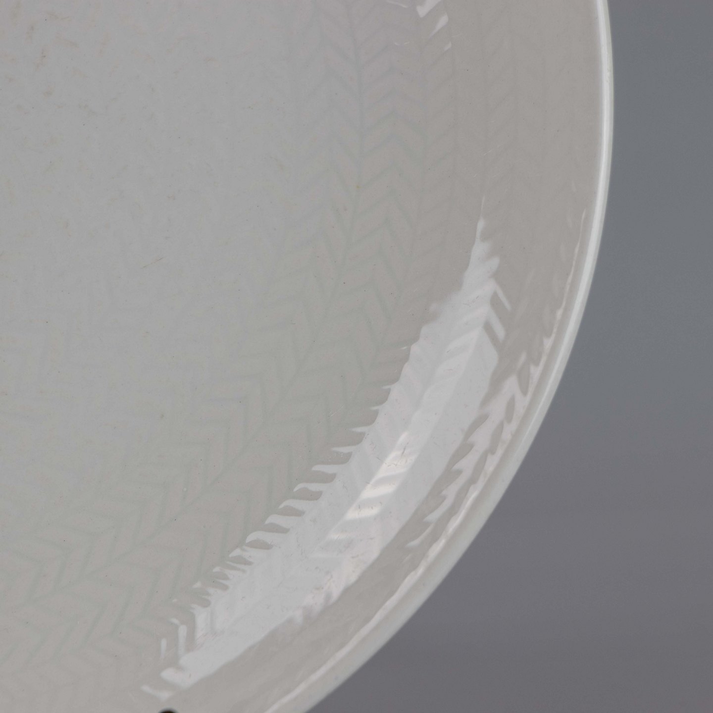 Flad tallerken fremstillet i i hvid fajance med indstøbt sildebensmønster.