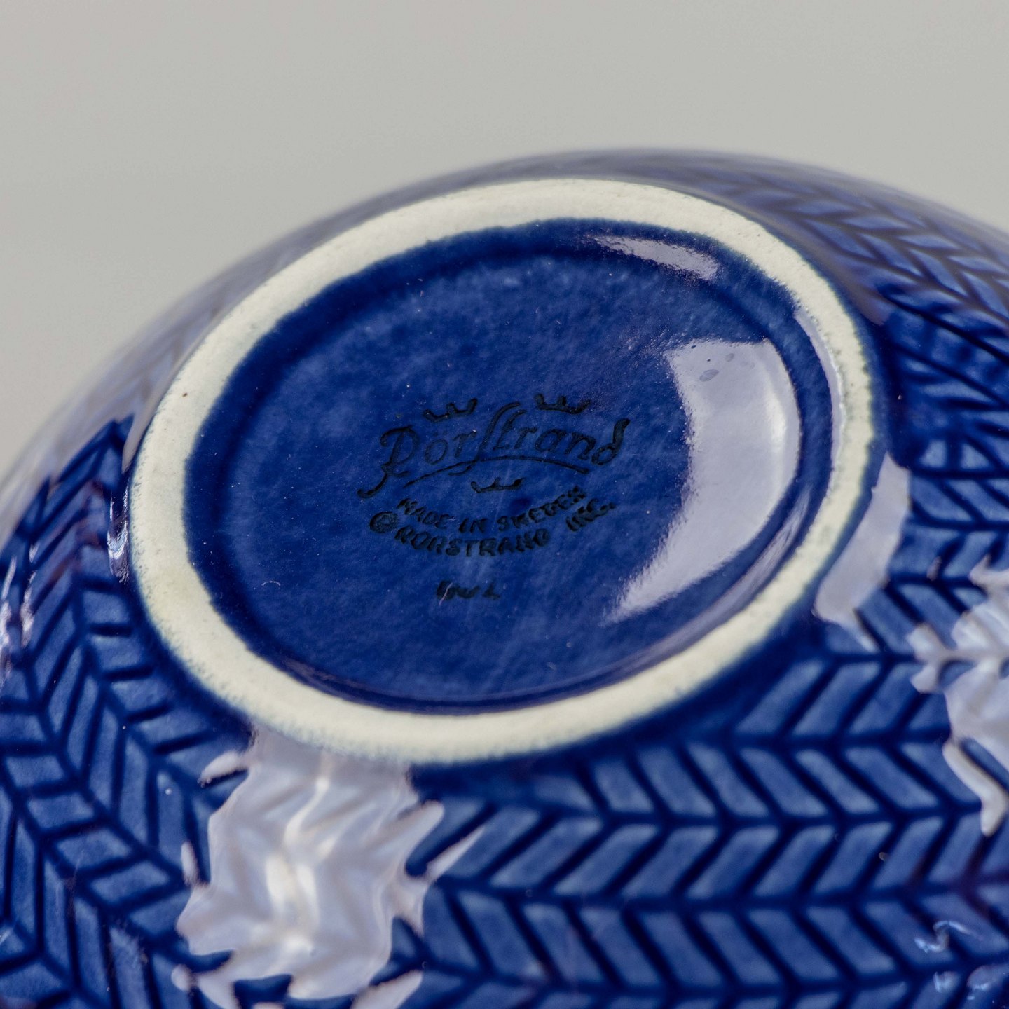 Skål fremstillet i blå fajance med indstøbt sildebensmønster.
