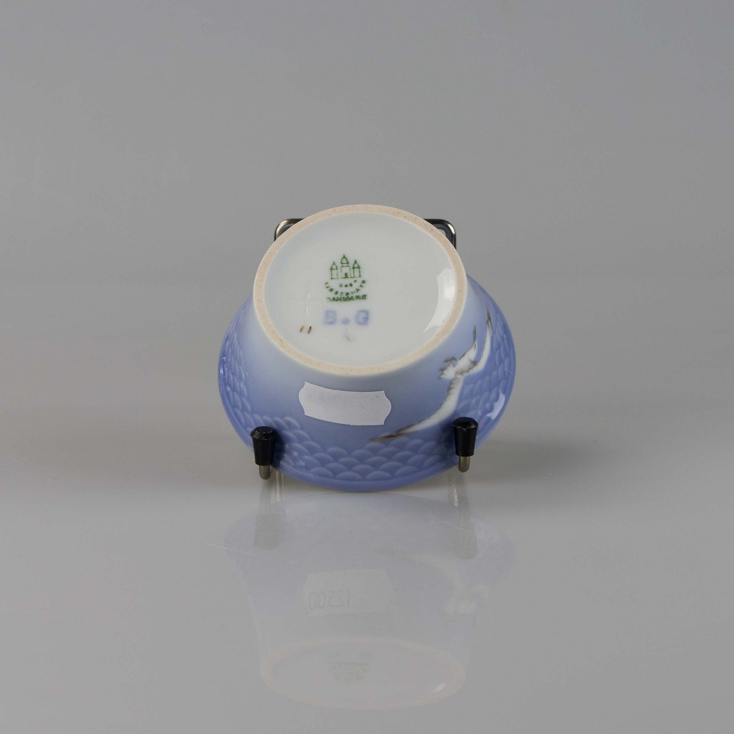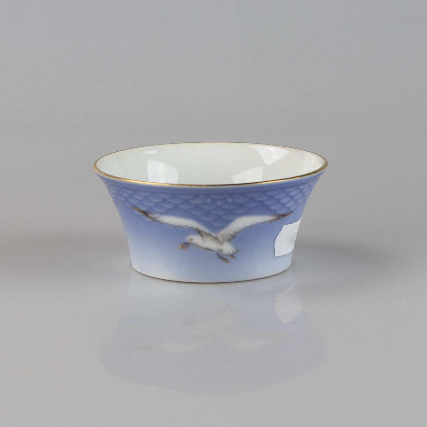 Bæger fremstillet i porcelæn med skelform i gradueret blå nuancer med guldkant samt motiv af måge.