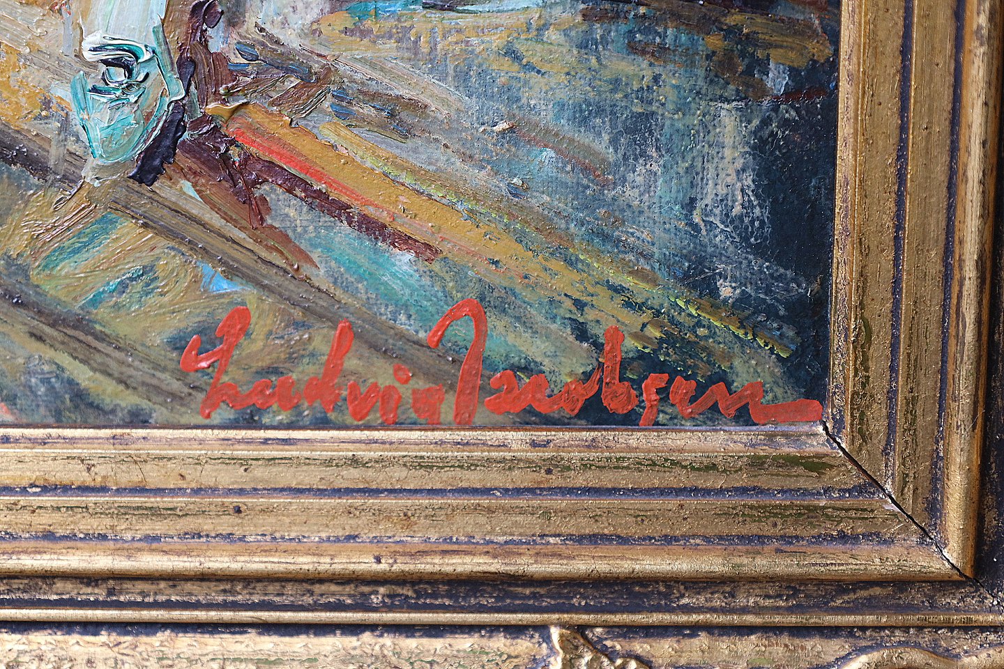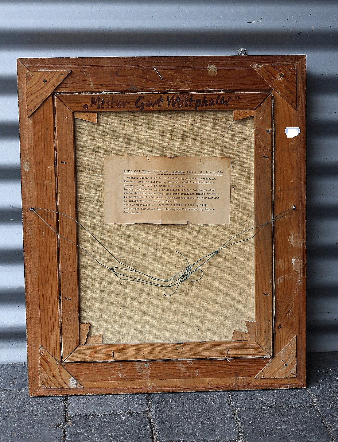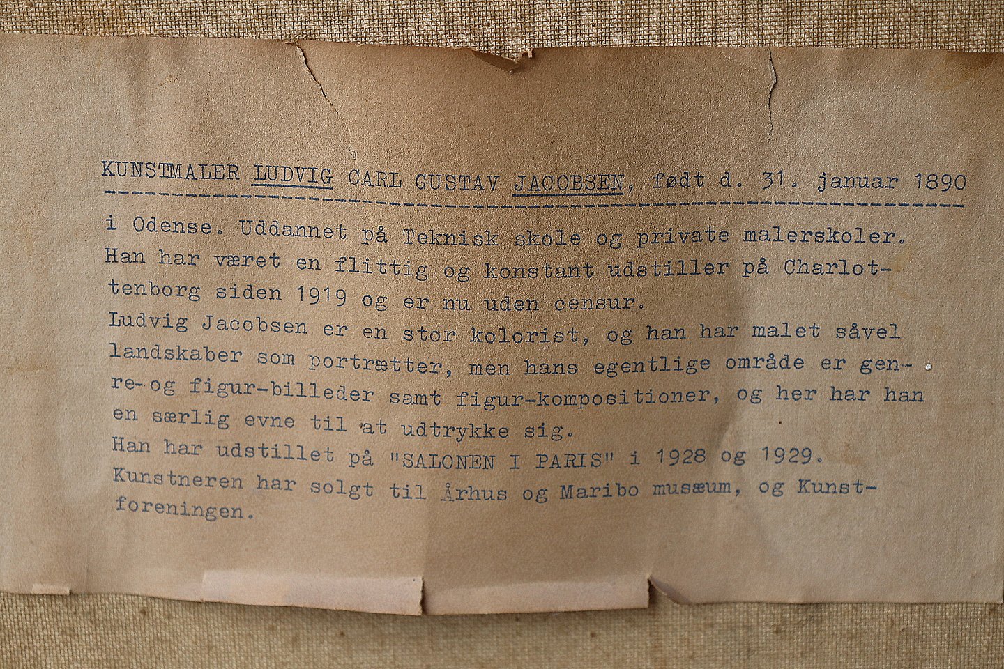 Ludvig Carl Gustav Jacobsen. Maleri, her med en figur-komposition. Dame der kommer ned af en trappe.