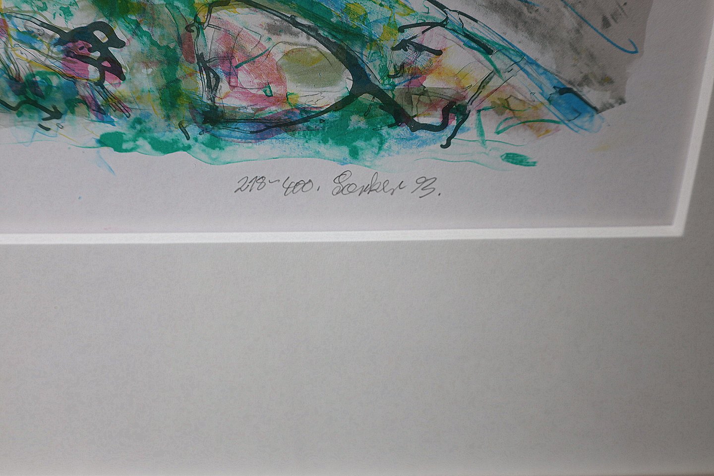 Kunstner Jørn Særker Sørensen. Litografi. nr 218/400. Litografiet forestiller en sommerhavn ved Furstrand. Litografiet er indrammet i passepartout.