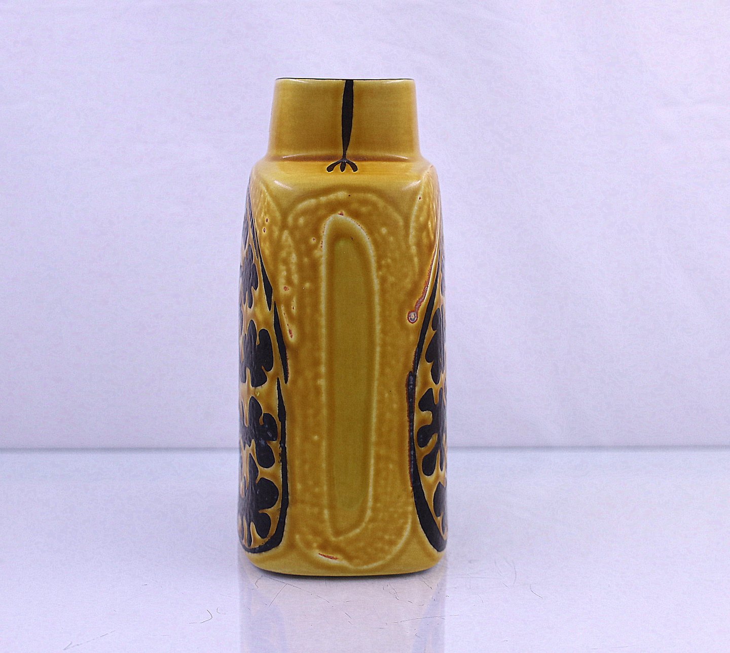 Vasen er karryfarvet med sort mønster.