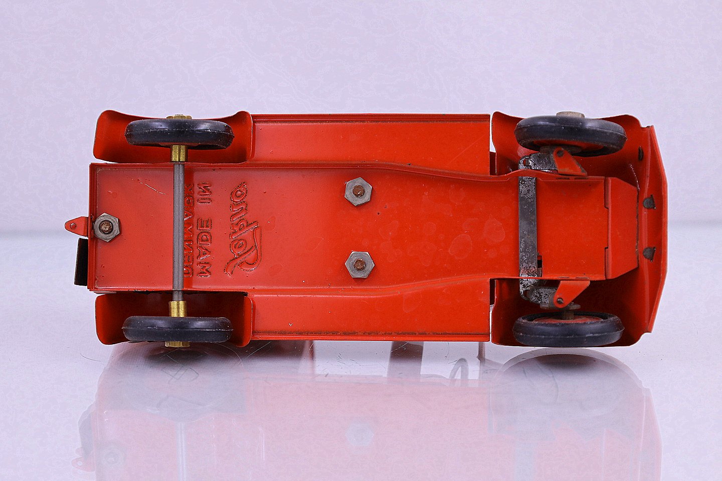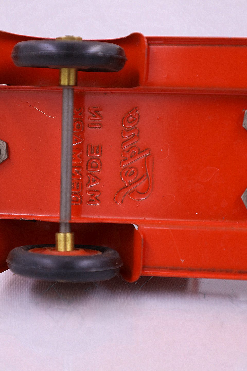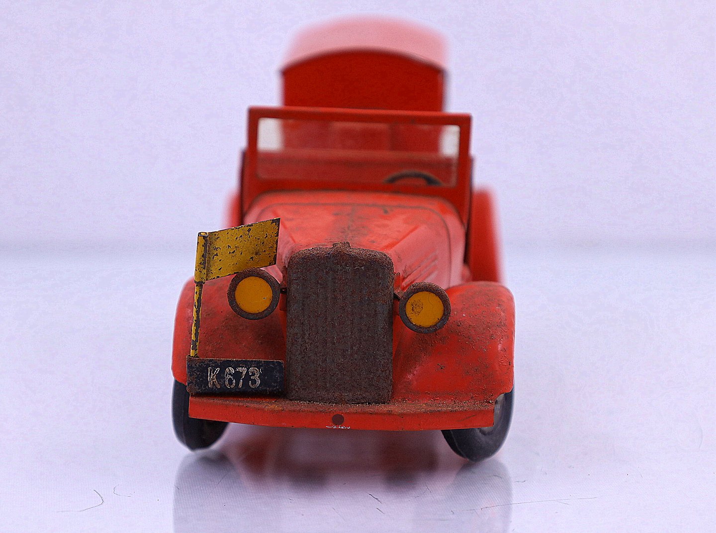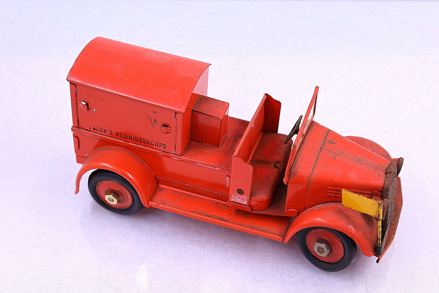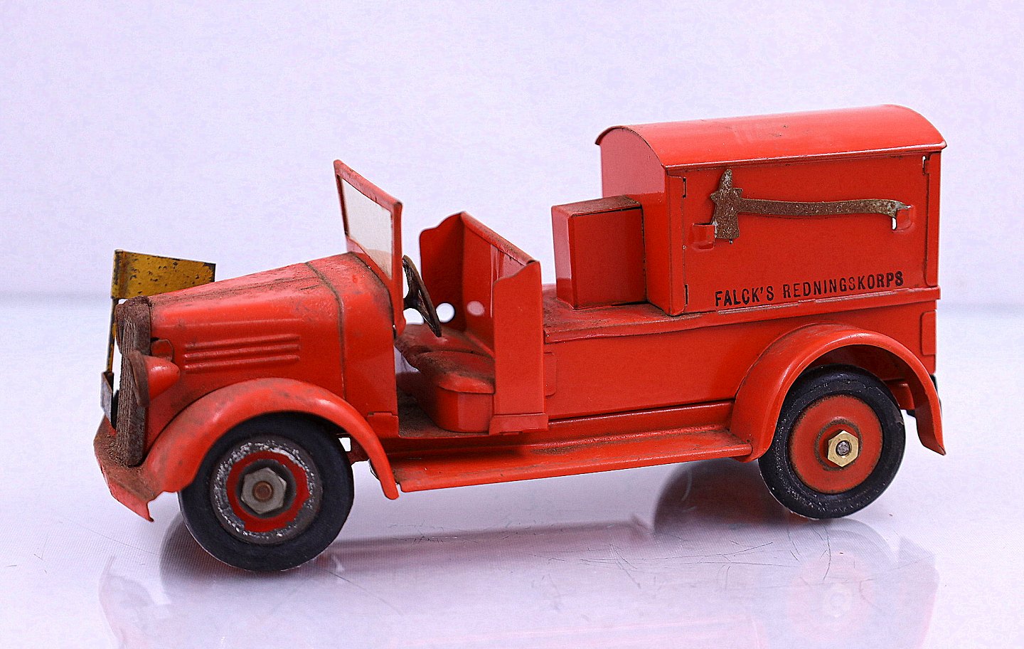 Ladvogn af blik med kasse. På kassen er der plads til økse og reservehjul. Vognen har også gult udryknings flag