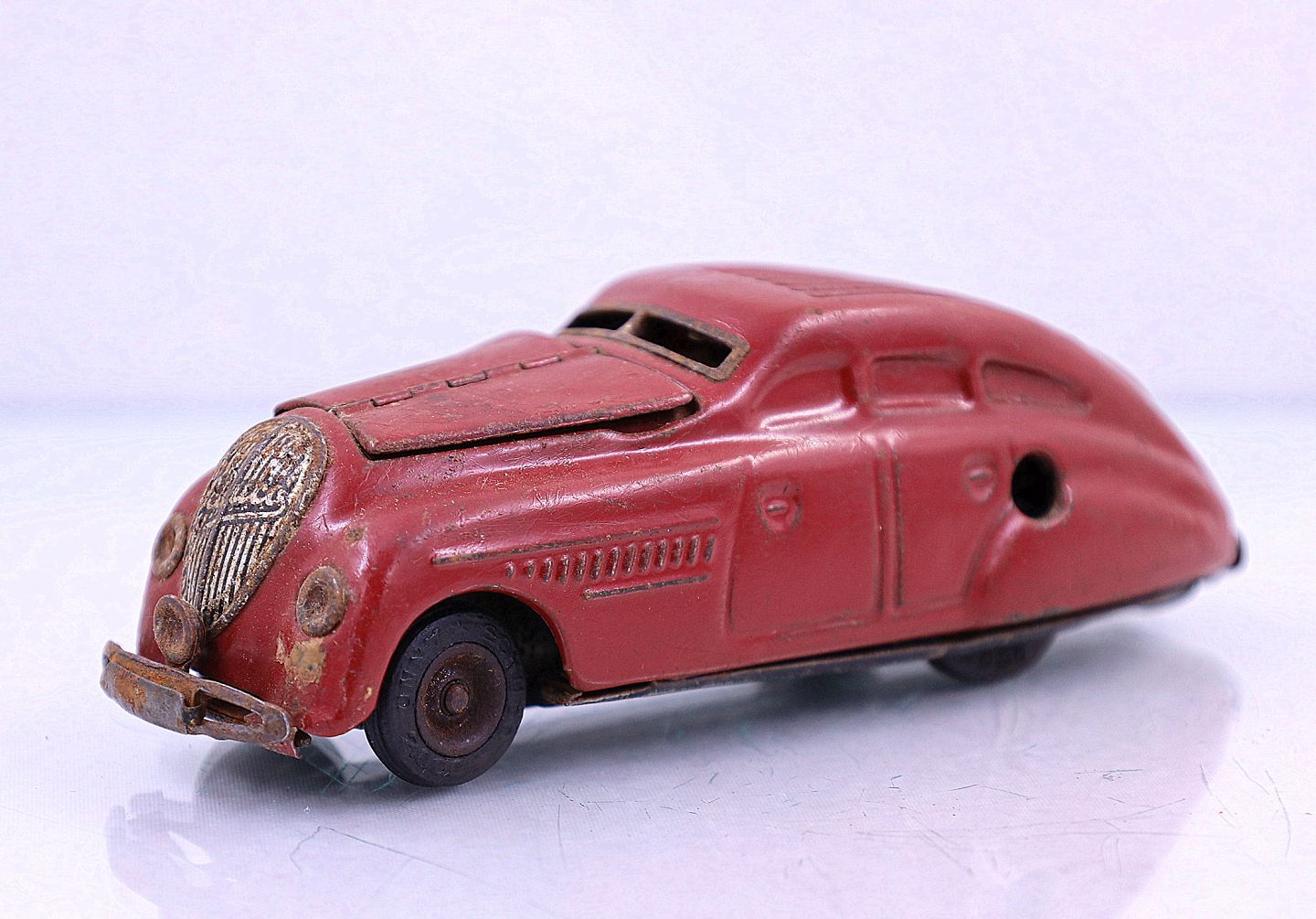 Schuco - Sportsvogn. Schuco Patent, "Magico Auto 2008", Tyskland 1940-1949. Der kan åbnes, i begge sider, til motoren. Sportsvognen er lavet af blik. Bilen er mørk rød, og bærer præg af slitage.