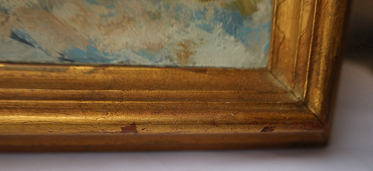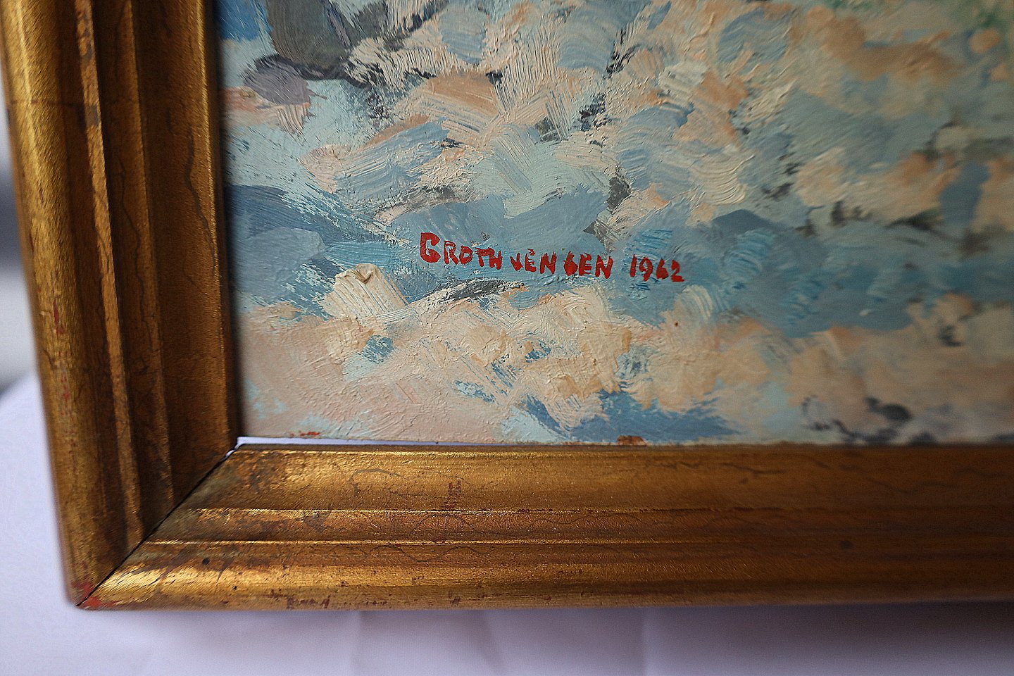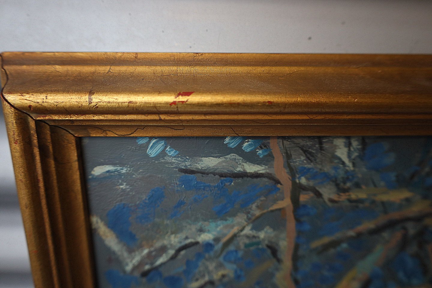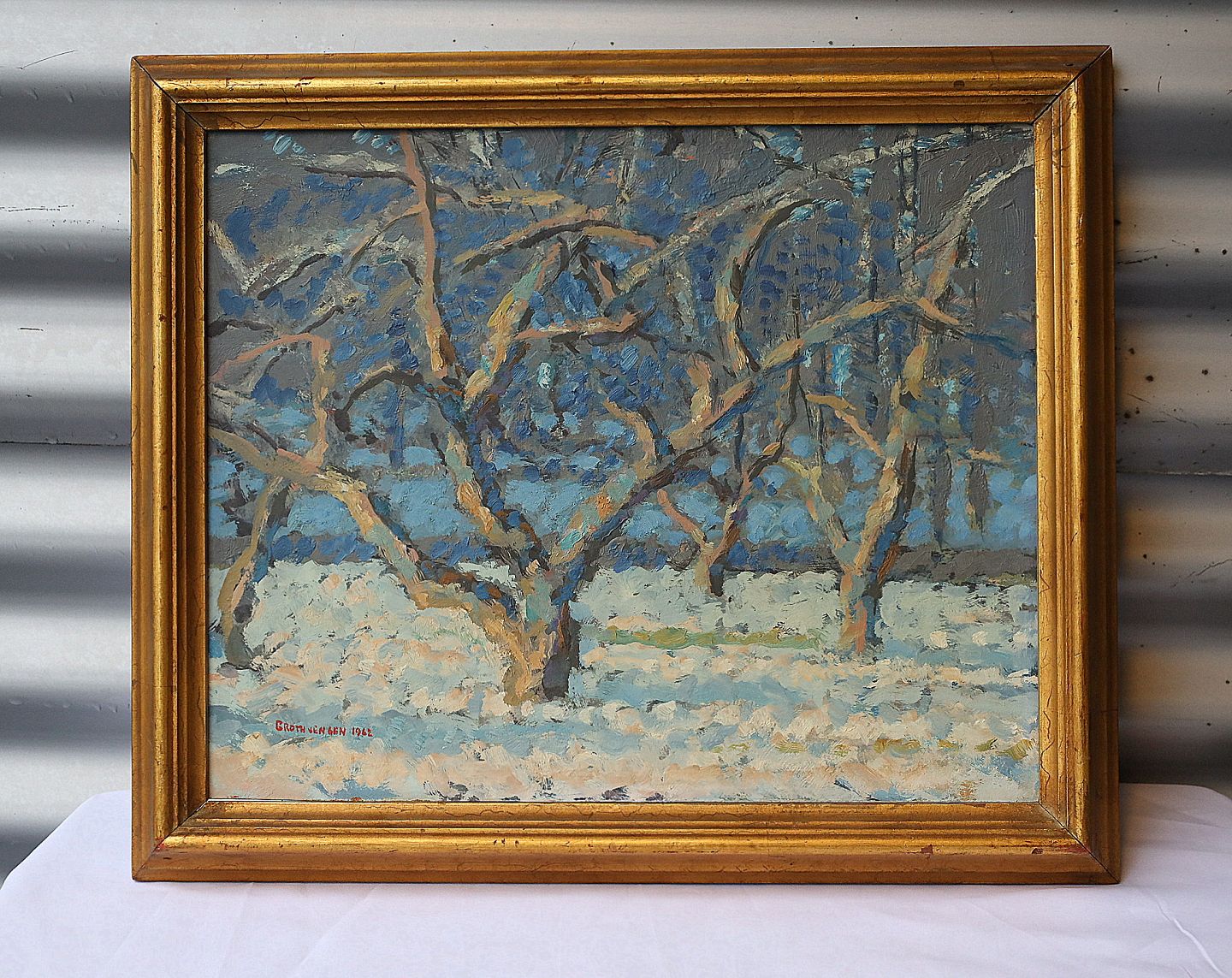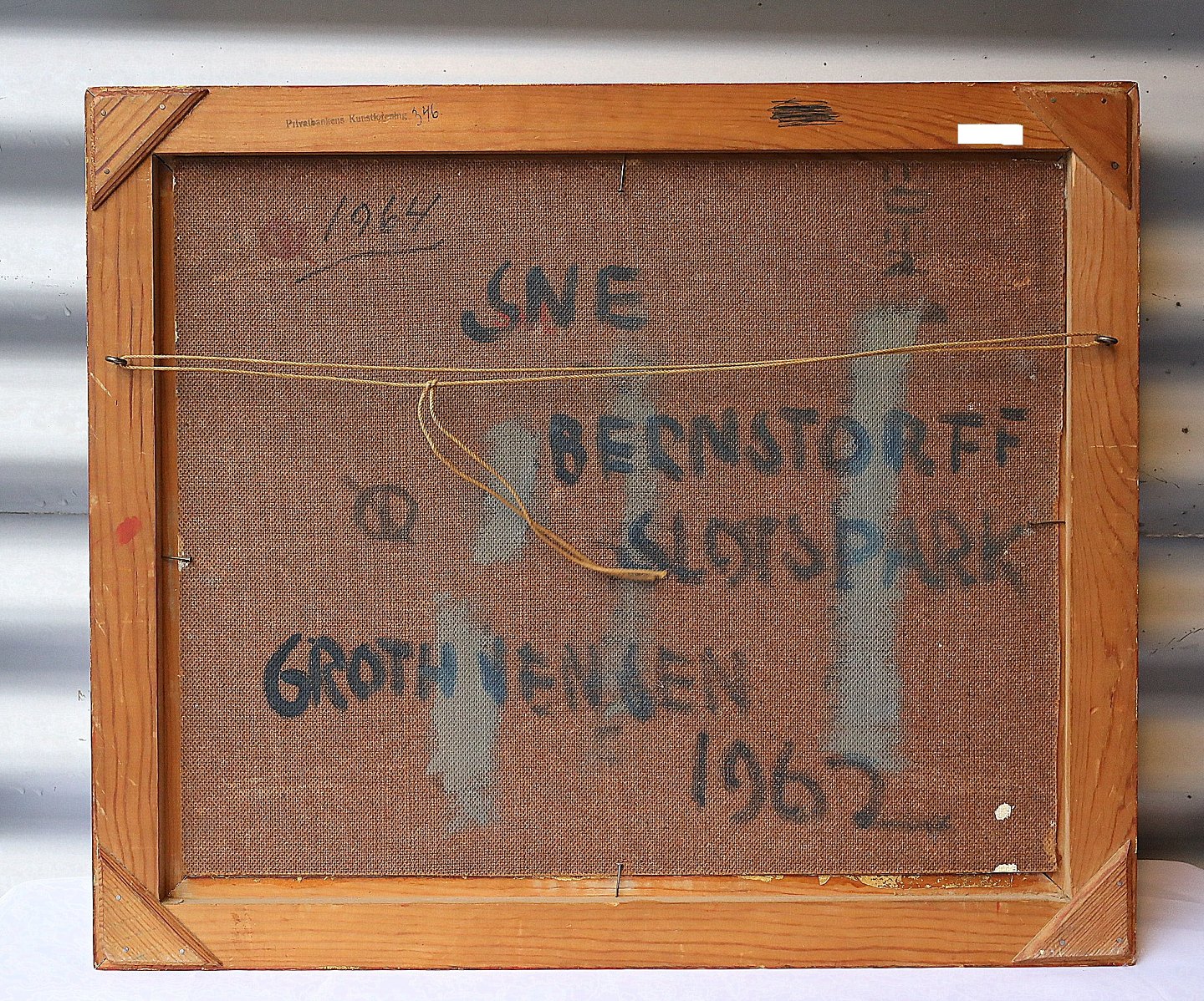 Groth Jensen, Jens Peter (1918-2018). Maleri, Sne i Bernstroff Slotspark, 1962. Der er enkelte brugsspor