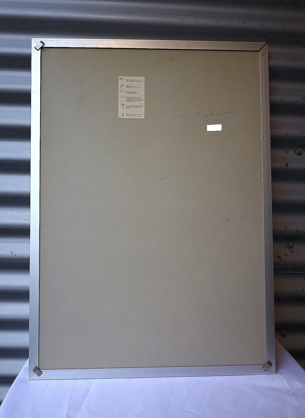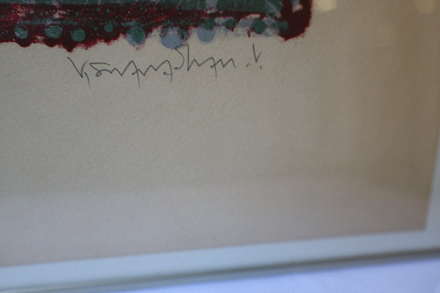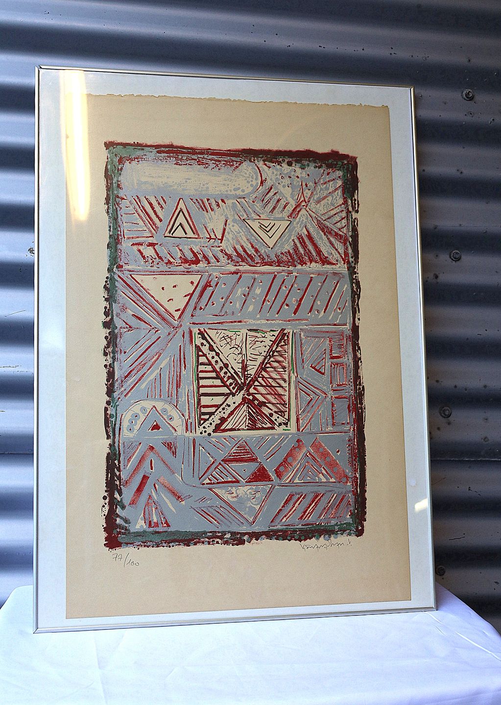 Velu Viswanadhan, Inder, født 1940. Litografi, nr. 77/100, i geometriske mønstre, i røde, grå farver. der er få brugsspor på rammen