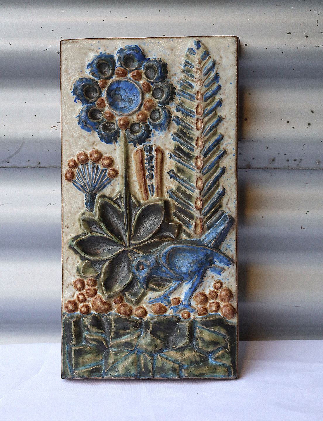 Michael Andersen, Bornholmsk Keramik. Relief nr. 6216. Relieffet forestiller fugl og blomster, farverne er gennemgående blå