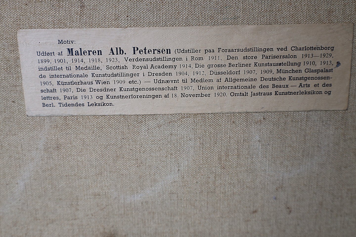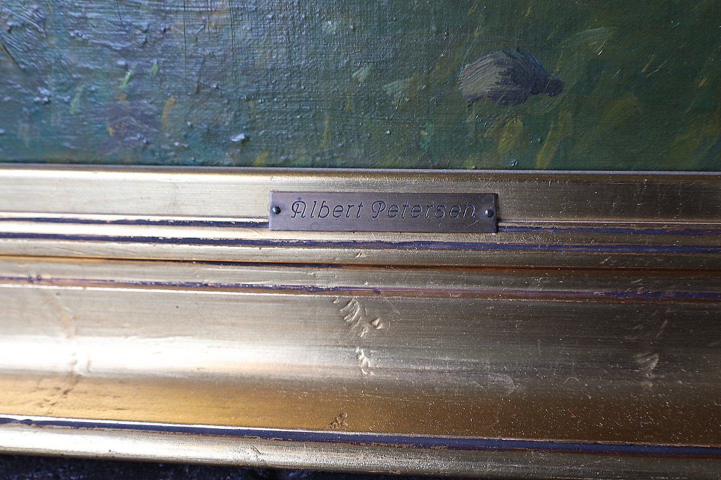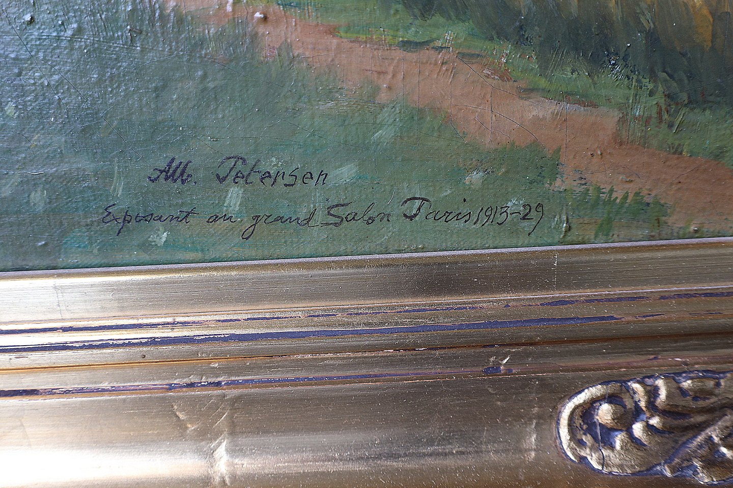Maleri. Parti af skov, med skovsø i baggrunden. Kunstmaler Albert Petersen. Inskription " Expo Sant on grand Salon Paris 1915-29" Signeret Alb. Petersen. Maleriet er i en stor guldramme, med ornamentering, rammen har enkelte brugsspor,