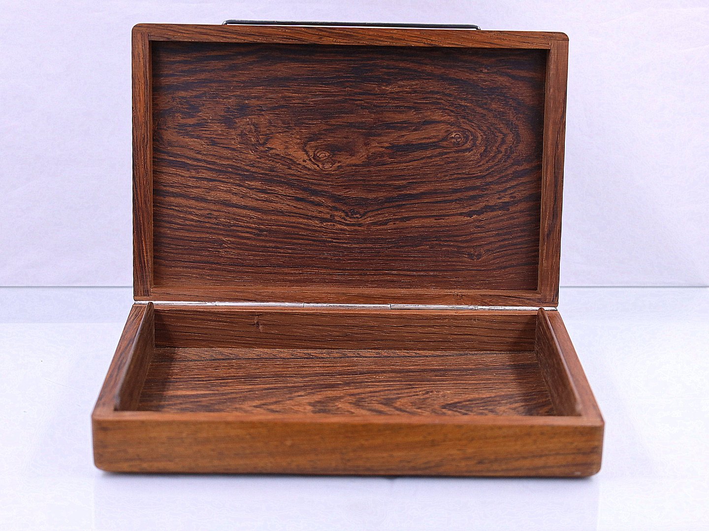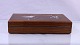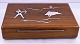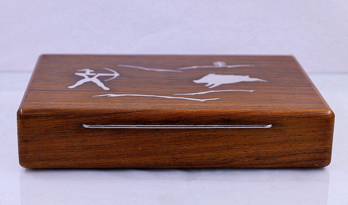 Cigaræske med jagtmotiv. Motivet er indlagt i sterlingsølv i låget, på æsken, og forestiller jæger der jager vildsvin med bue og pil