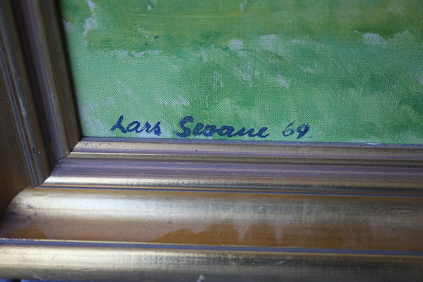 Maleri, Lars Swane (1913-2002). Hav motiv med små både. Signeret Lars Swane -69. Maleriet er i guldramme, med enkelte brugsspor.