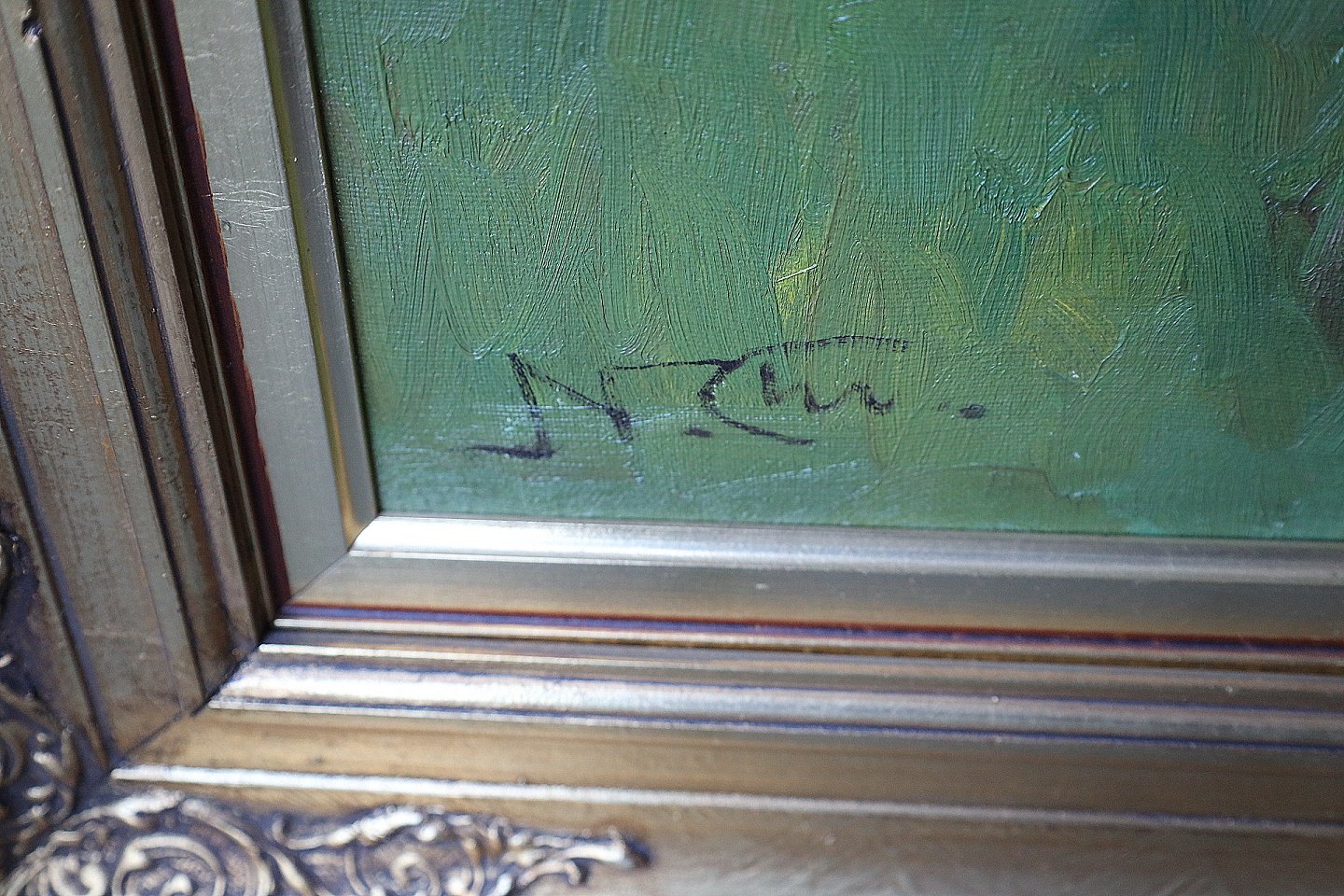 Maleri, Niels Christiansen (1873-1960). Græssende kreaturer på engen. Signeret N. Chr. Maleriet er i guldramme, med ornamentering i hjørnerne, der er enkelte brugsspor på rammen.