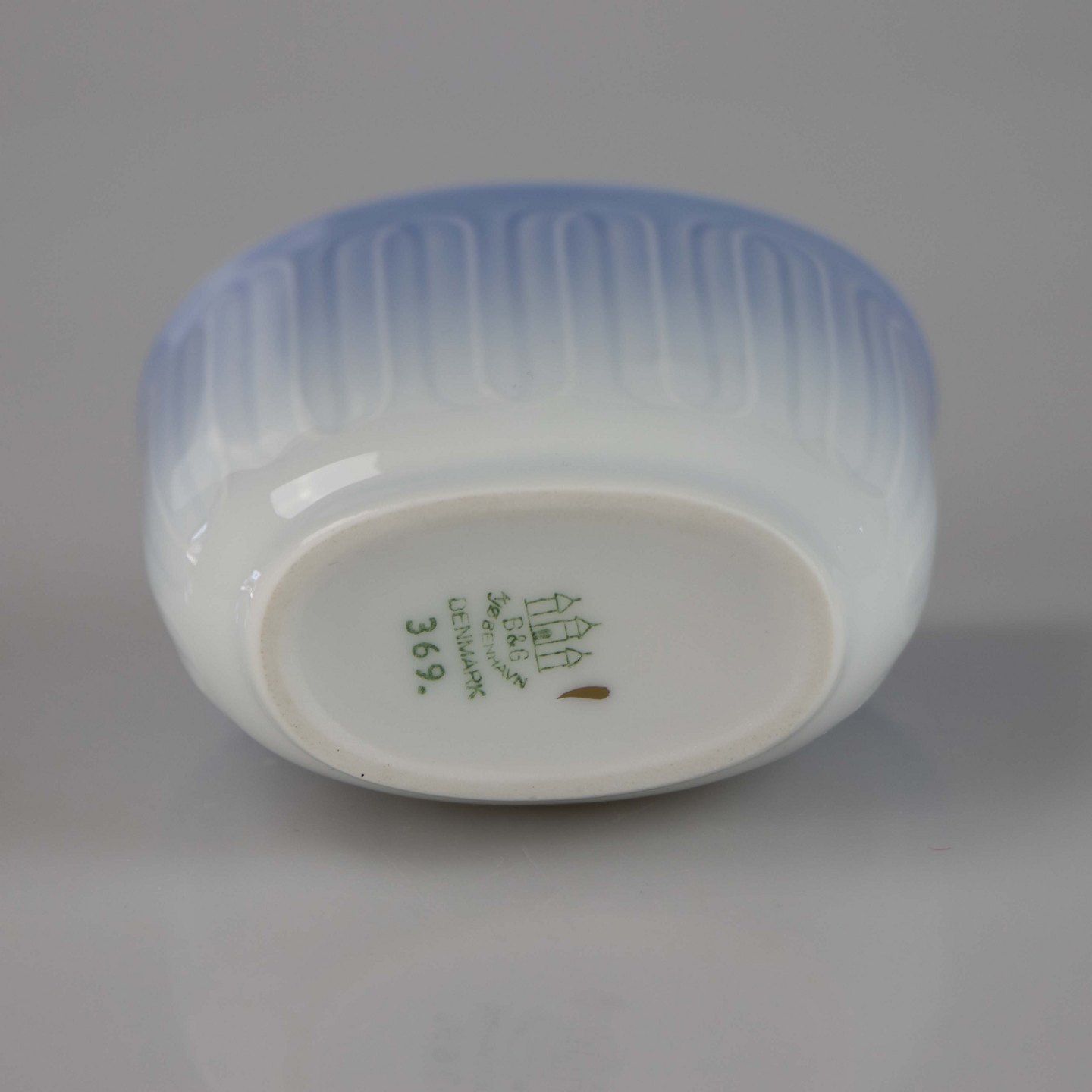 Bæger fremstillet i porcelæn med stribet motiv i gradueret blå nuancer.