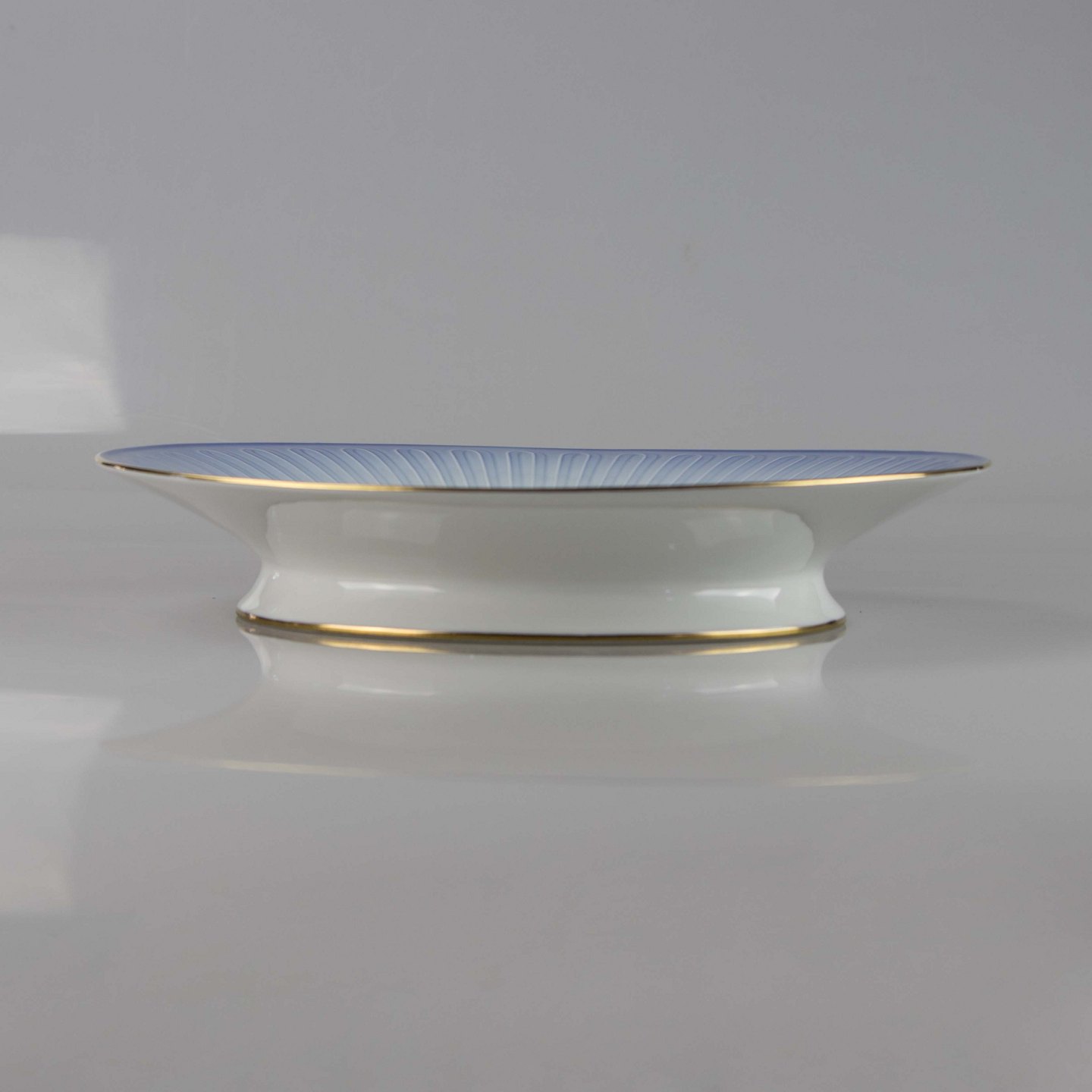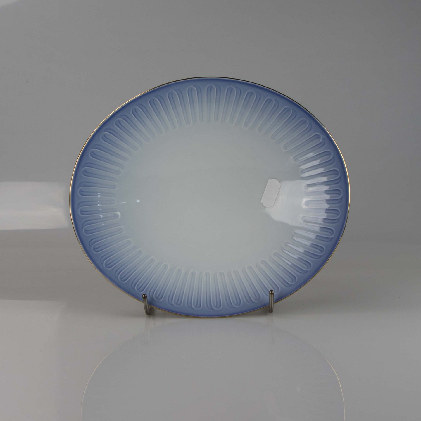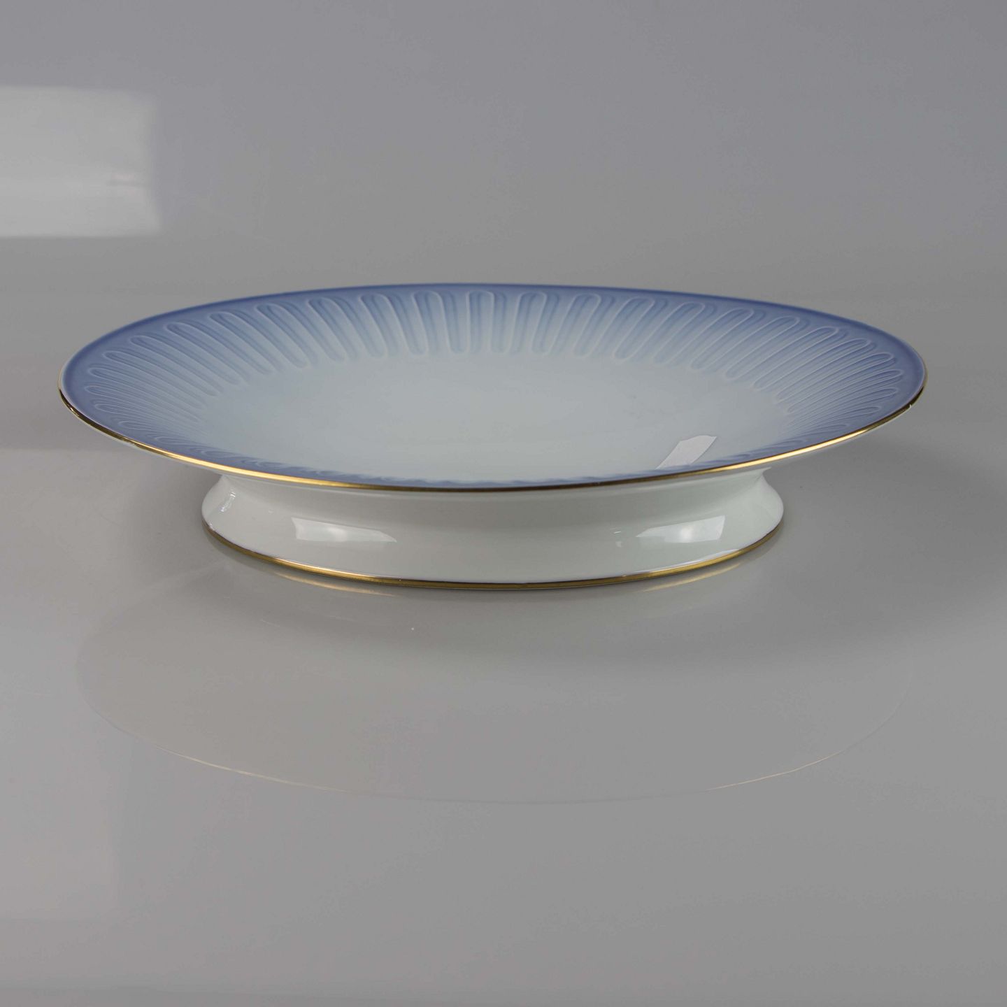 Fad fremstillet i porcelæn med stribet motiv i gradueret blå nuancer.