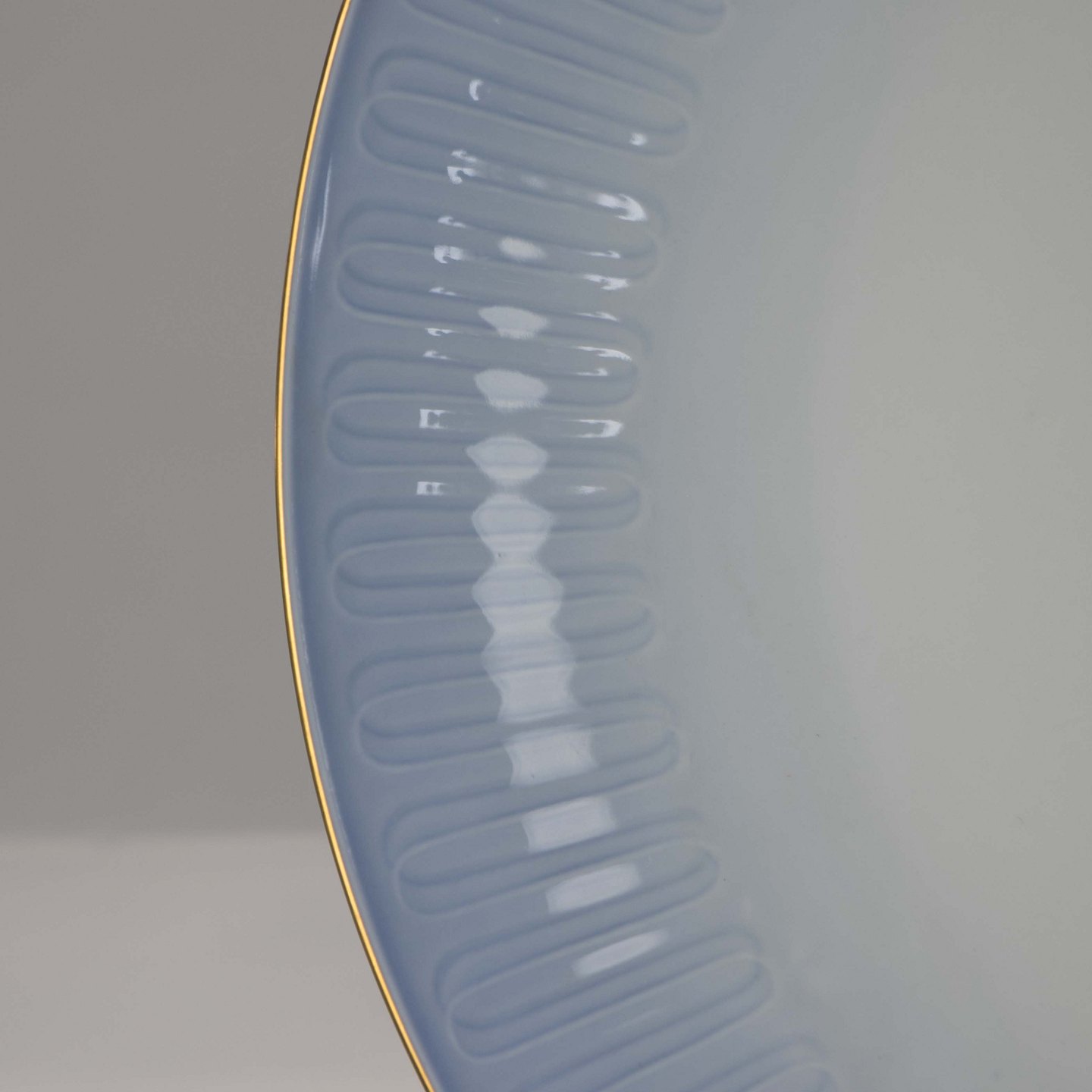 Fad fremstillet i porcelæn med stribet motiv i gradueret blå nuancer.