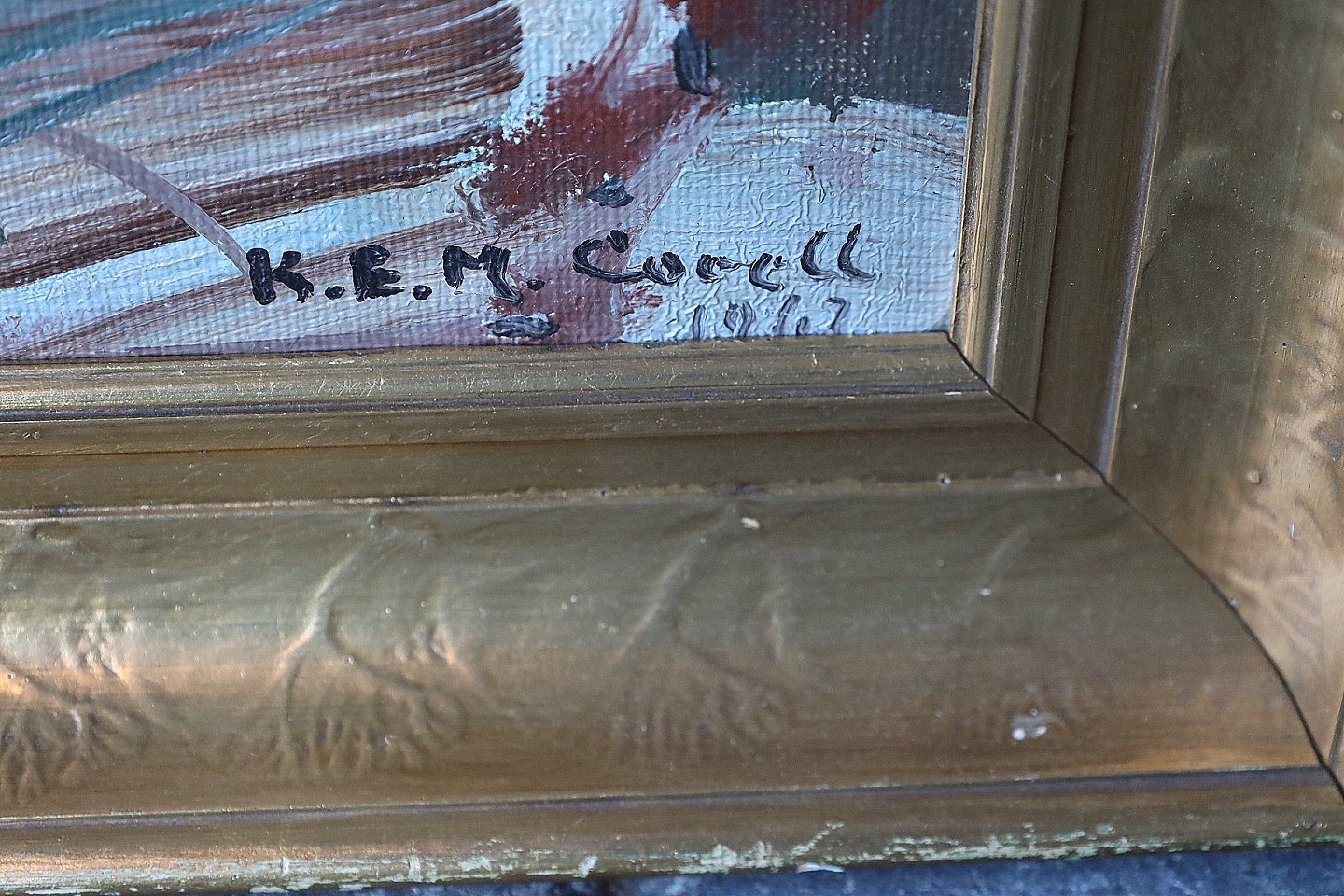 Maleri. K E M Corell (1903). Udsnit af havn på Bornholm., Stilarten er Naturalistisk. Maleriet er ornamenteret guldramme, med enkelte brugsspor.