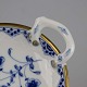 Fad i hvidt porcelæn med guldkant med blå motiver af blomster og sommerfugle.