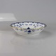 Skål i hvidt porcelæn med guldkant med blå motiver af blomster og sommerfugle.