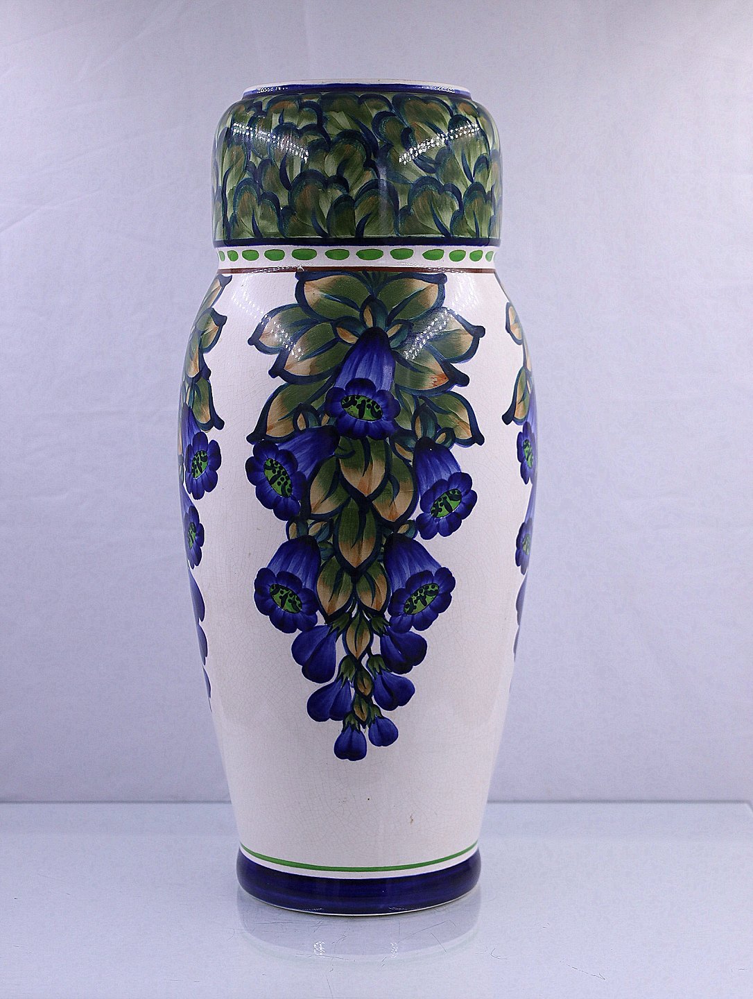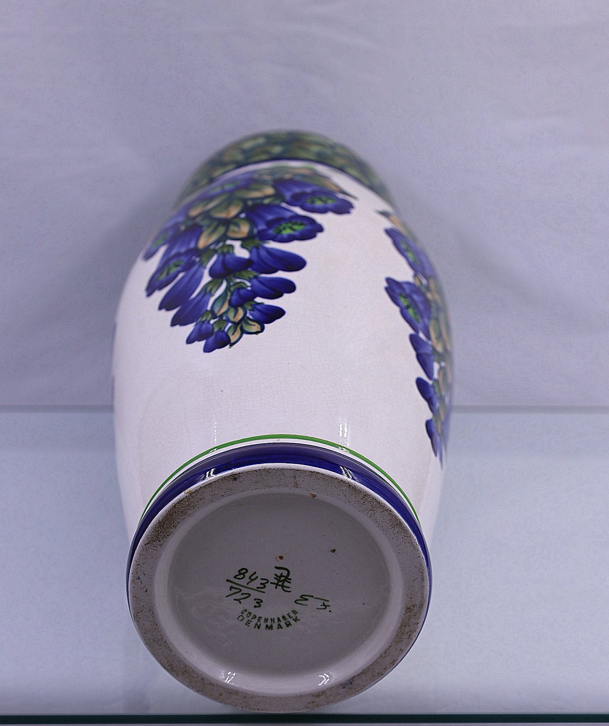 Aluminia vase, nr. 843/723. Vasen er dekoreret, med blå blomster. Blomsterne ligner klokker, bladene er grønne og brune. Vasen har en lille hårrevne i top, ses indvendigt fra.