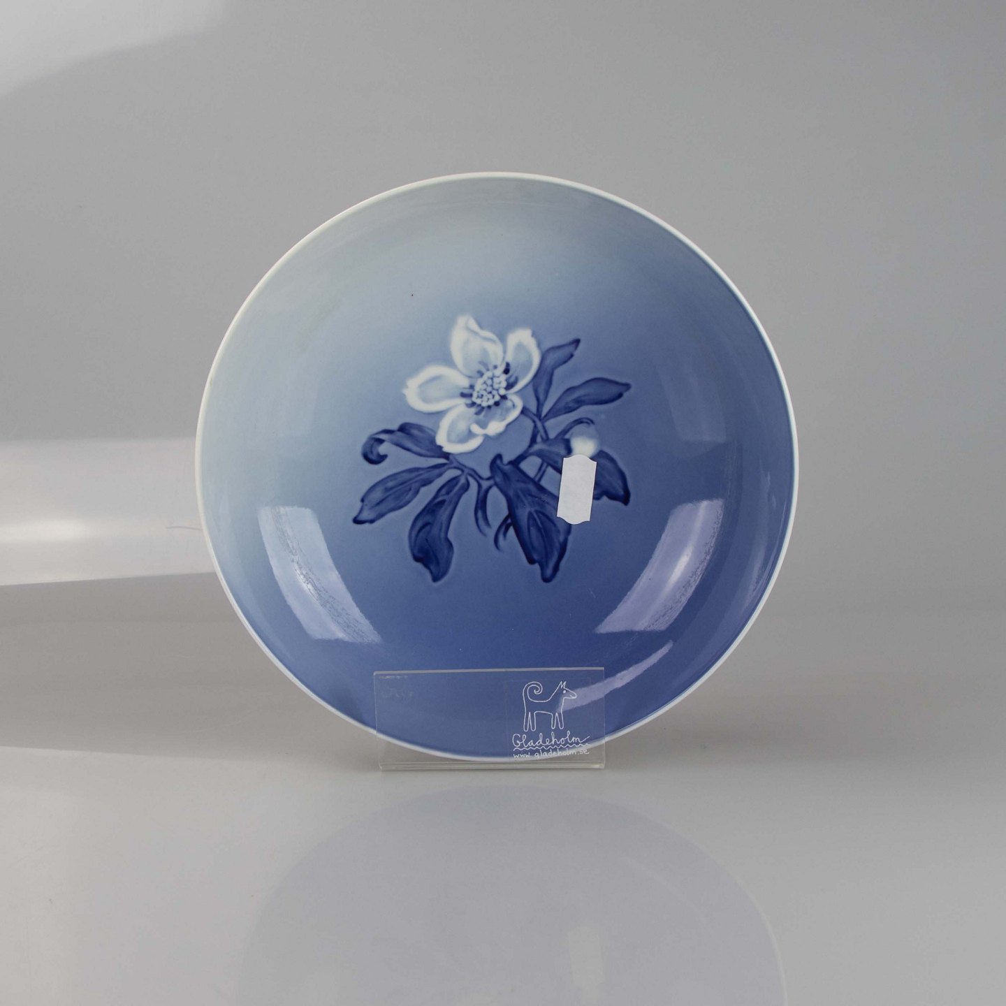 Skål i hvidt og gradueret blå porcelæn med motiv af julerose.