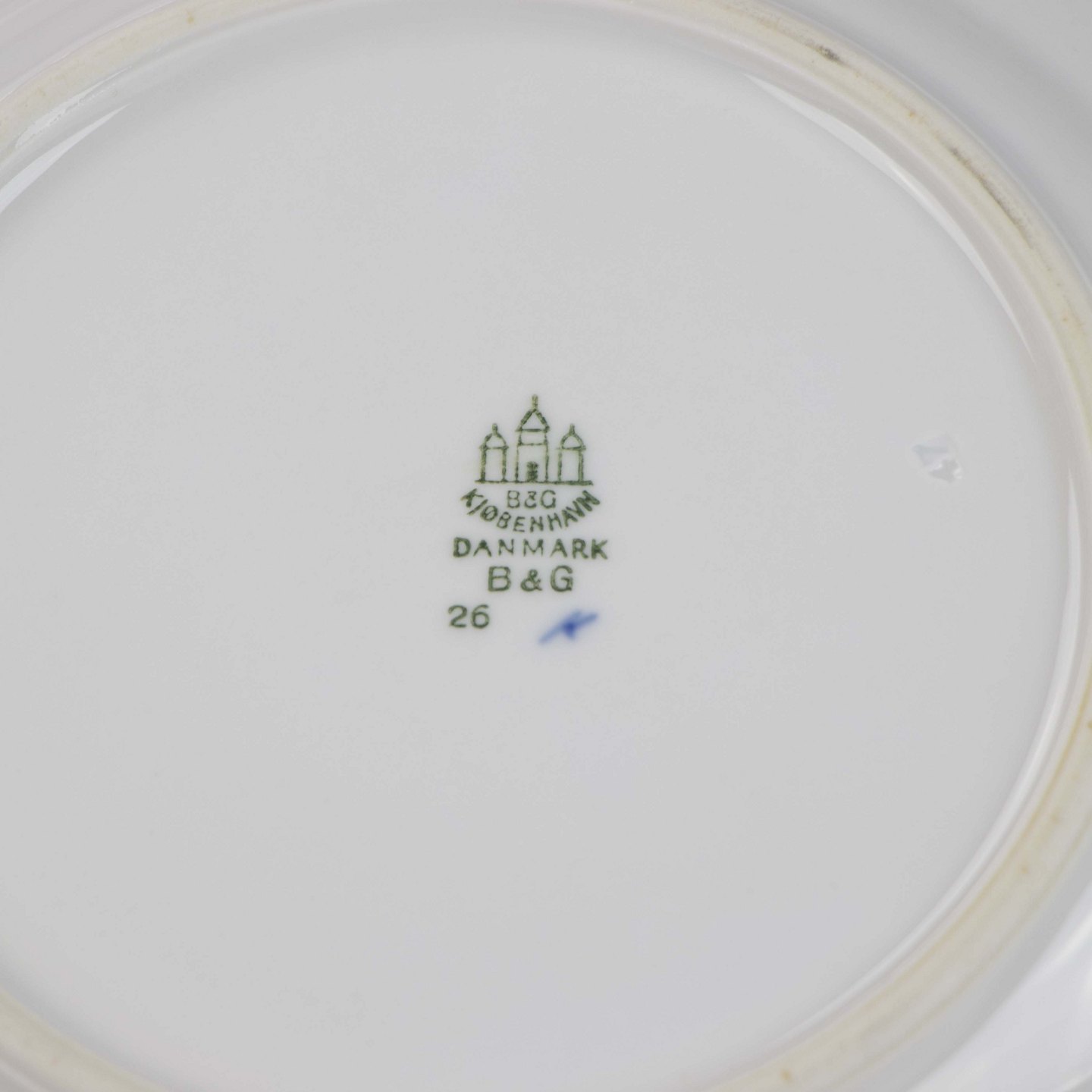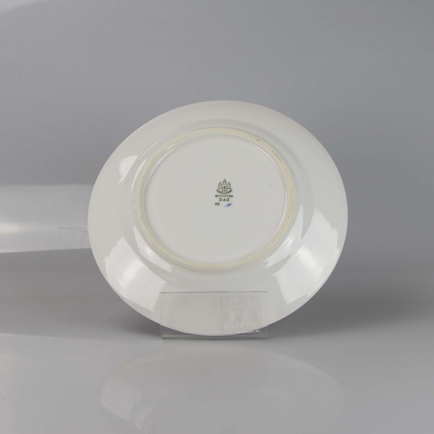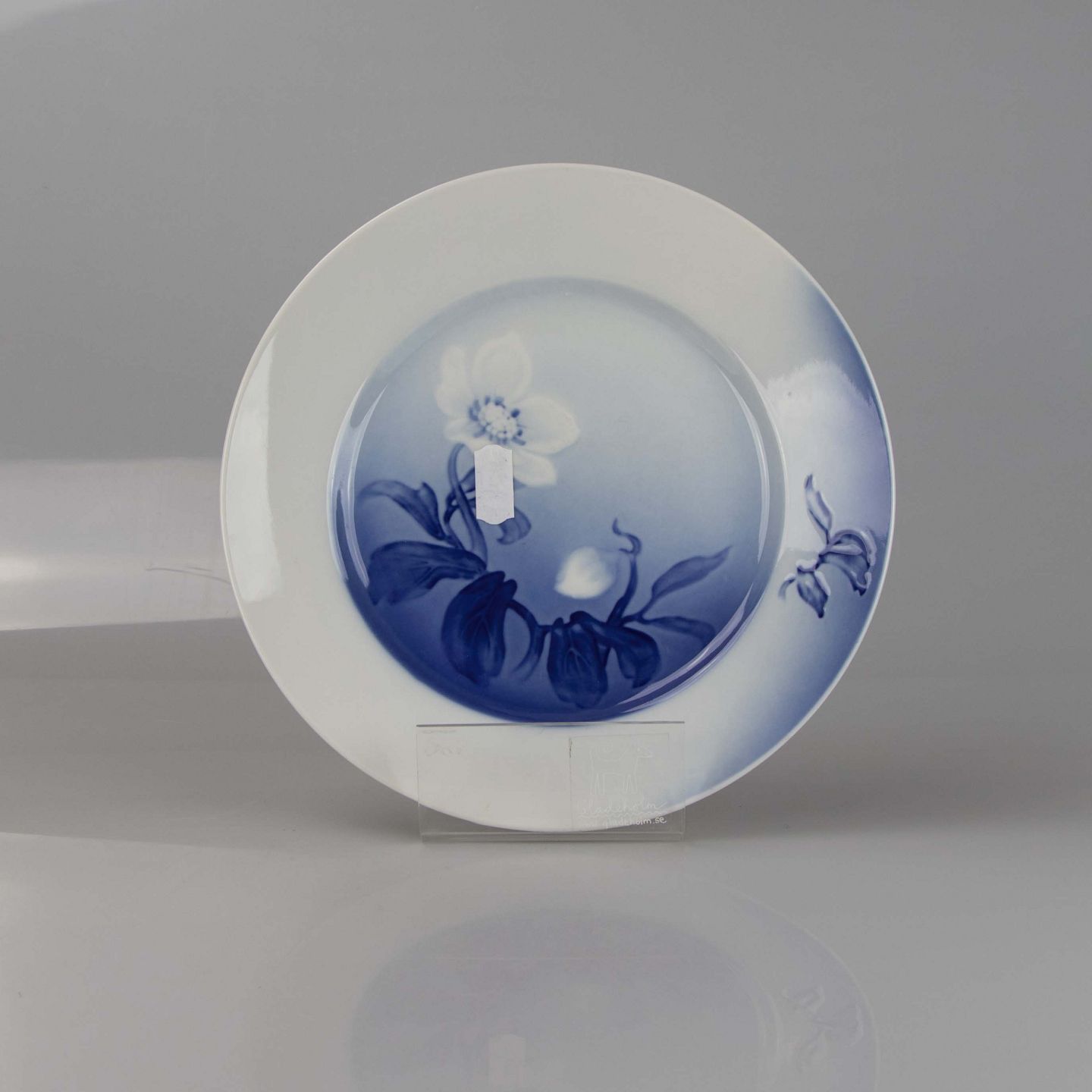 Flad tallerken i hvidt og gradueret blå porcelæn med motiv af julerose.