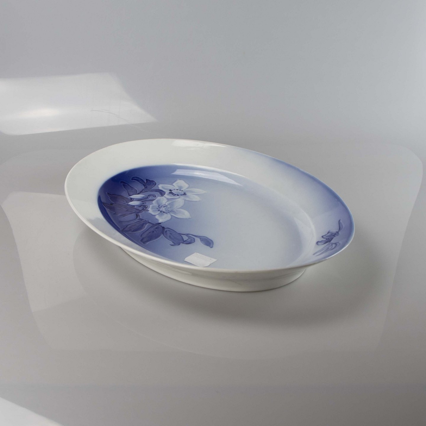 Serveringsfad i hvidt og gradueret blå porcelæn med motiv af julerose.