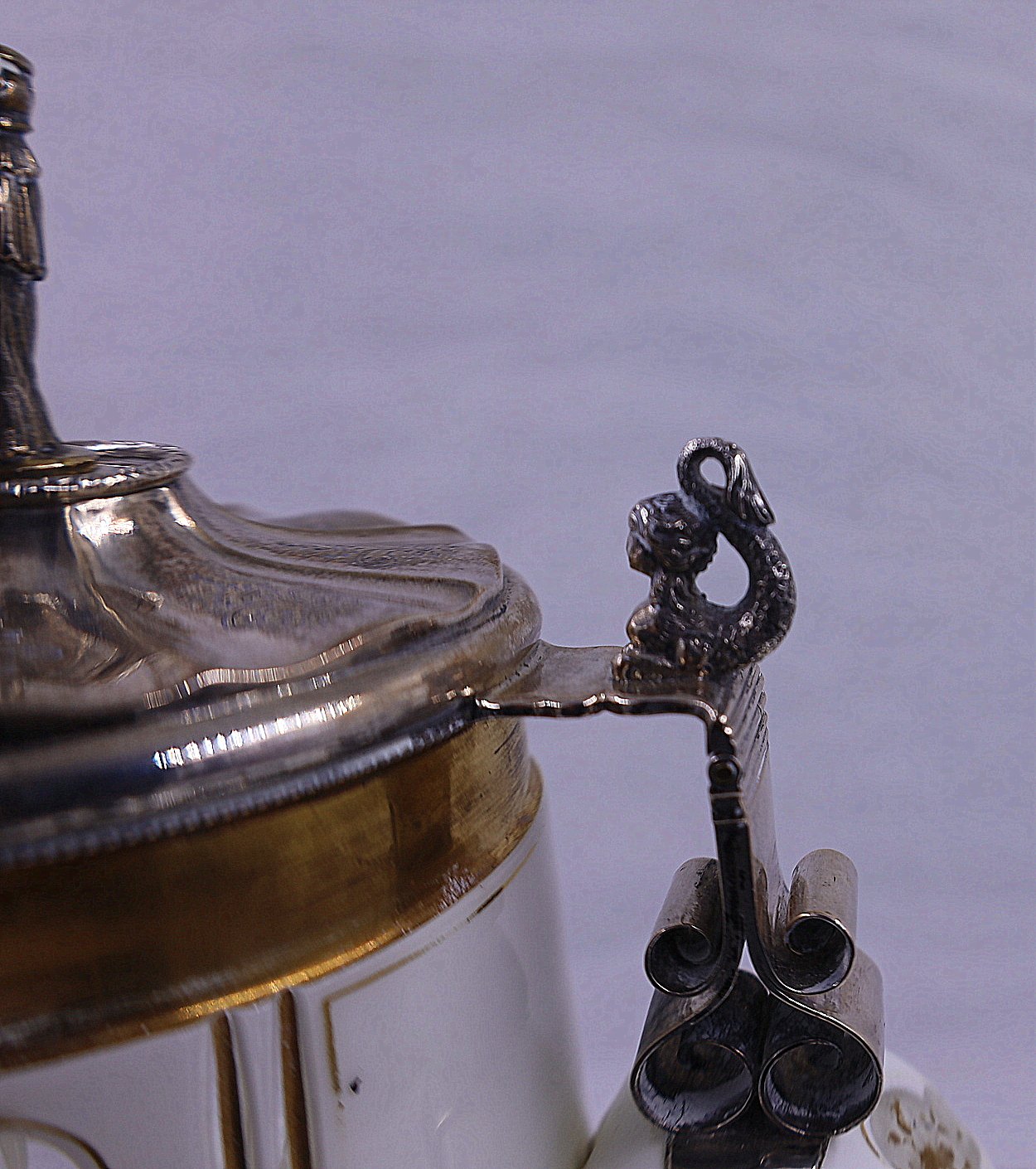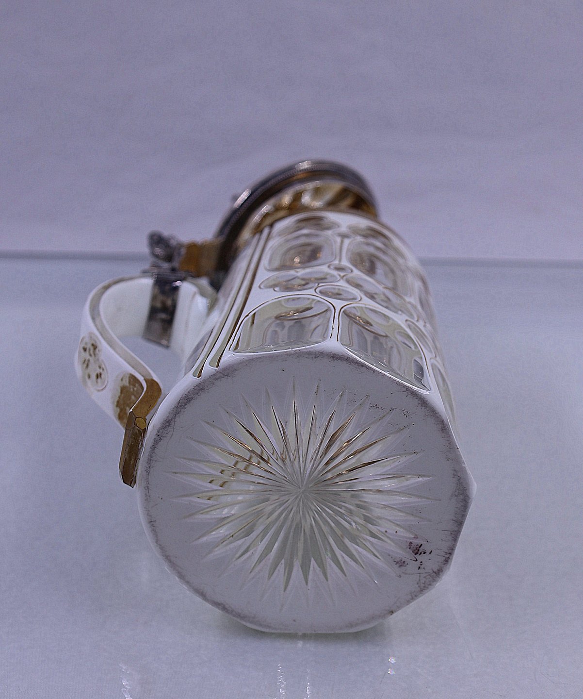 Drikkekrus med vippelåg, på toppen af låget står der en madonna. Glasset er med facetslibninger. Låget er af sølv