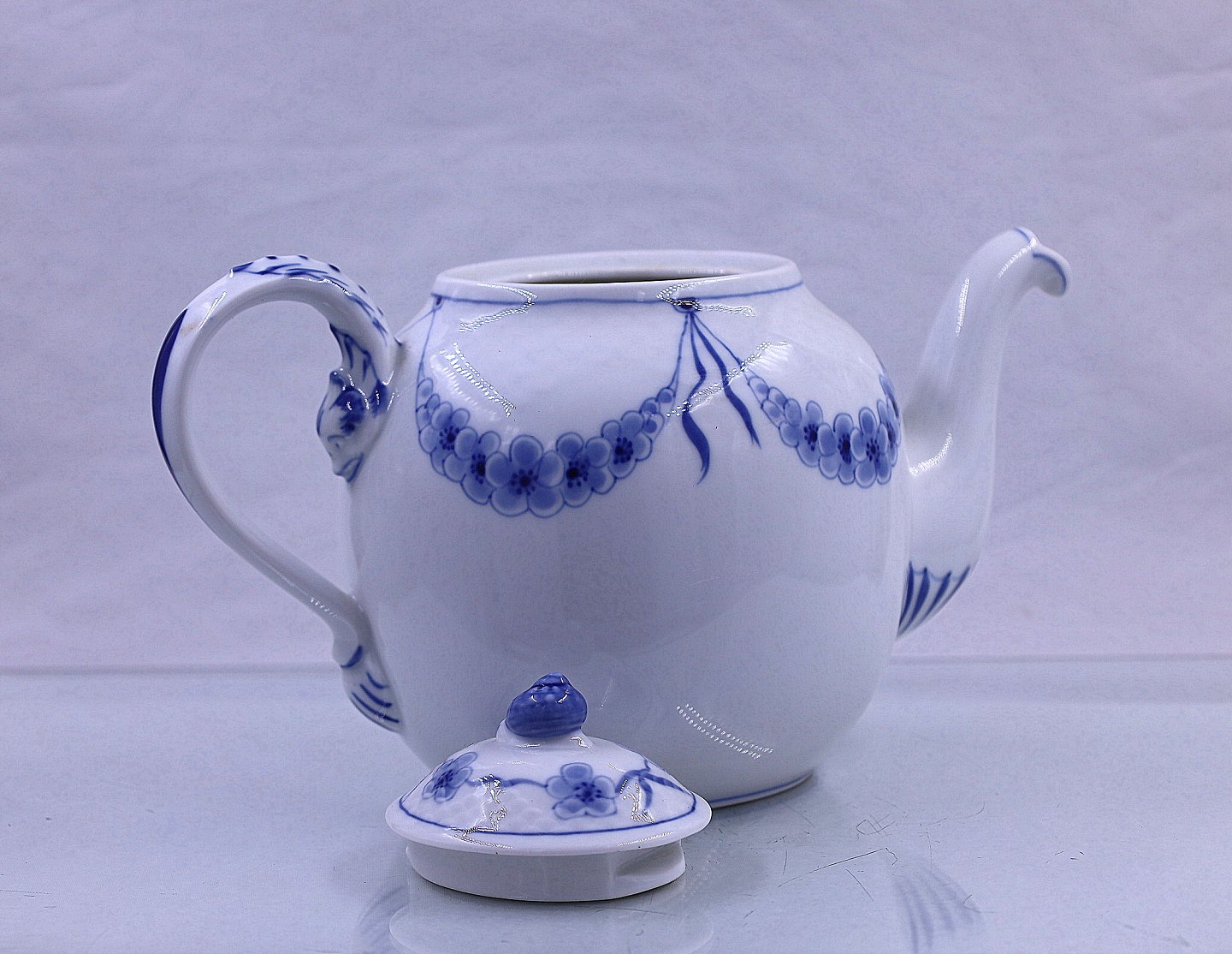 Bing & Grøndahl. Empire Thekande nr. 238, thekanden er oval. Empire er hvidt med skælborter og svungne blomster dekorationer. Thekanden har brugsspor indvendig.