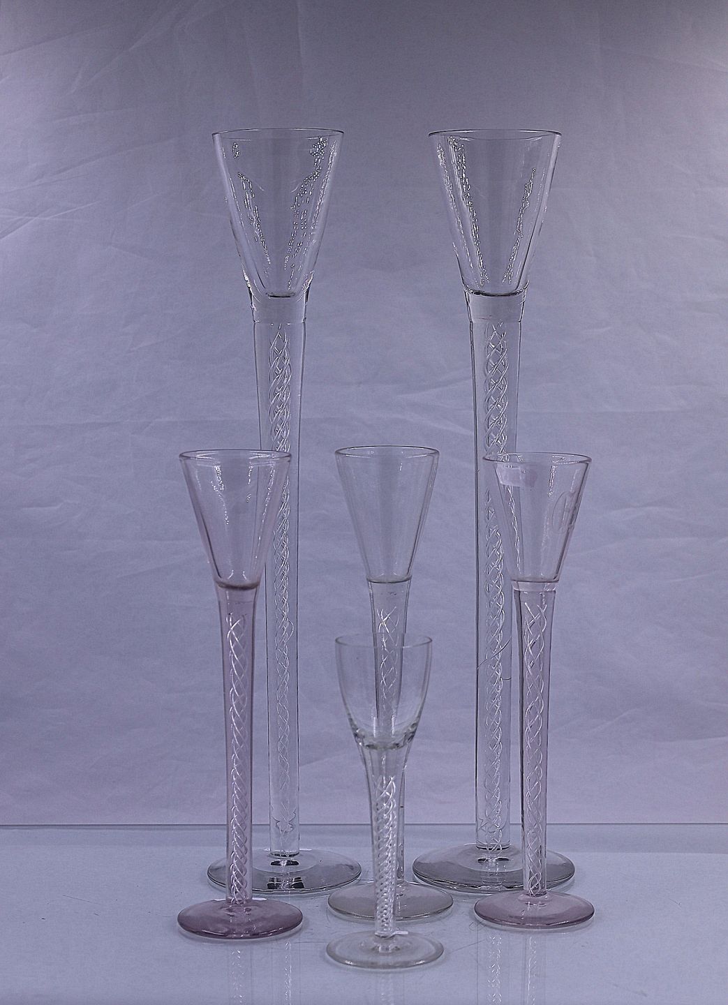 Holmegaard -/ Kastrup Glasværk. Glas på høj stilk, med kegleformet kumme. Glassene har luftspiral i stilk. Et af glassene har graveret initialer, se foto.