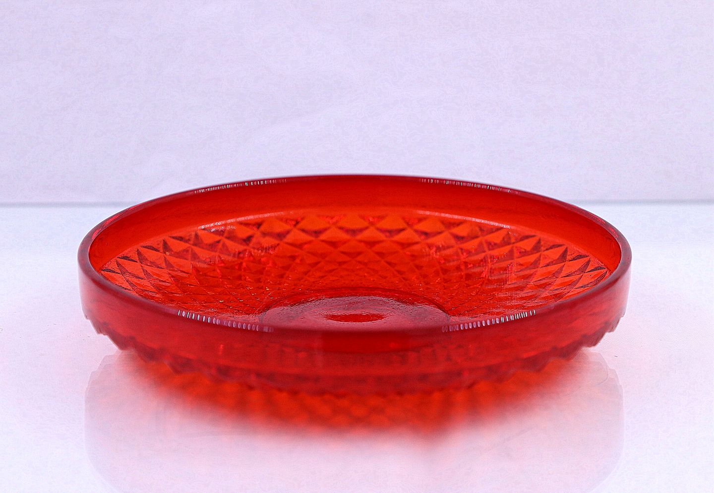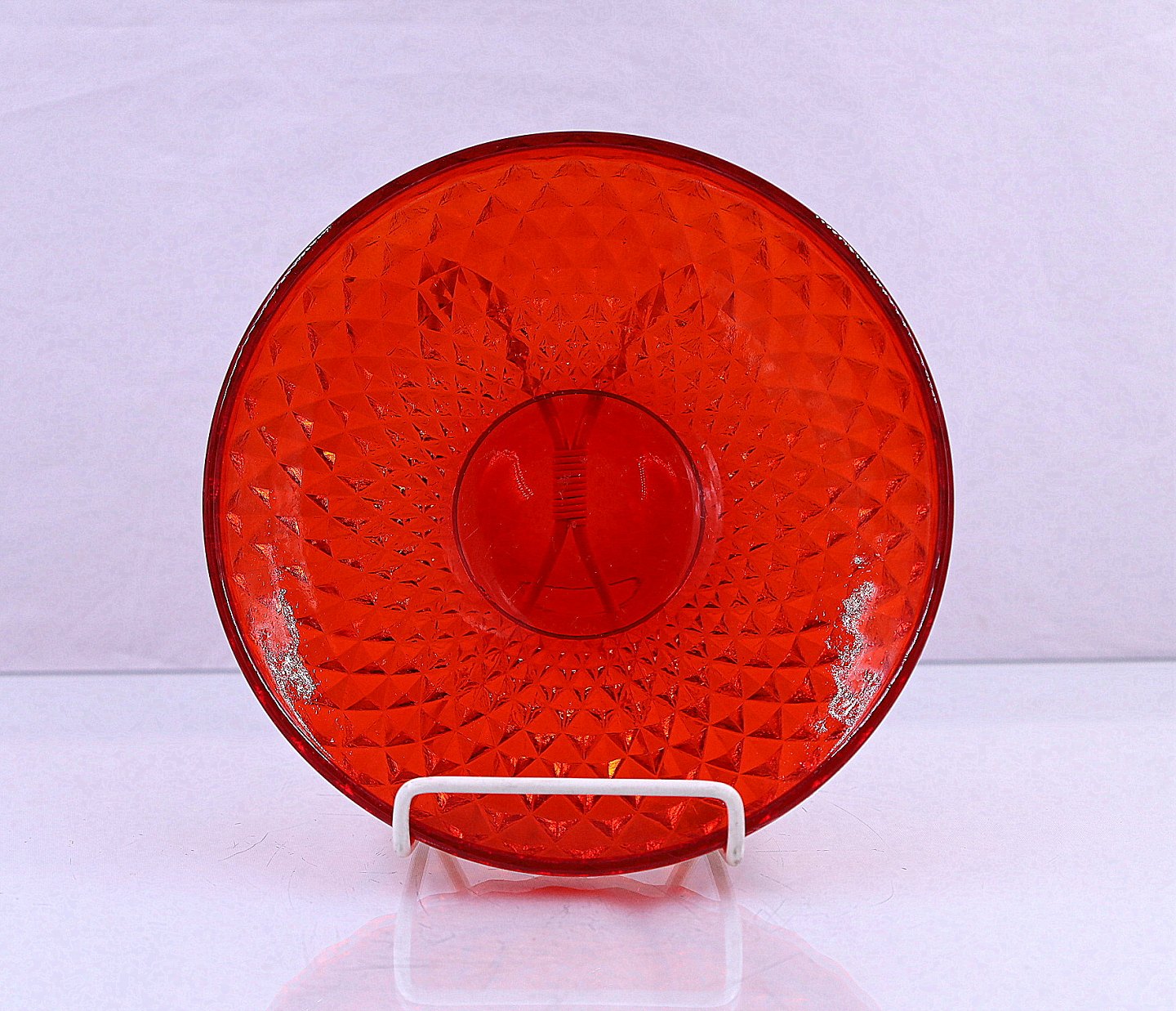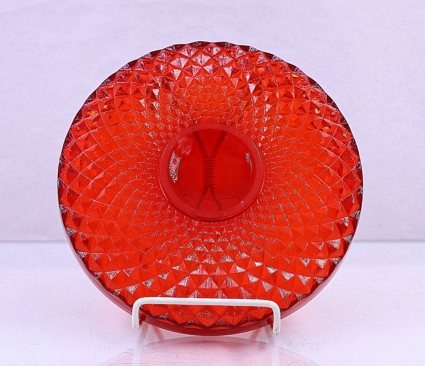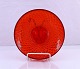 Rød assiette. Presset glas, muligvis Fyens Glasværk. Kan være Odin assiette. Der er ingen skår eller revner