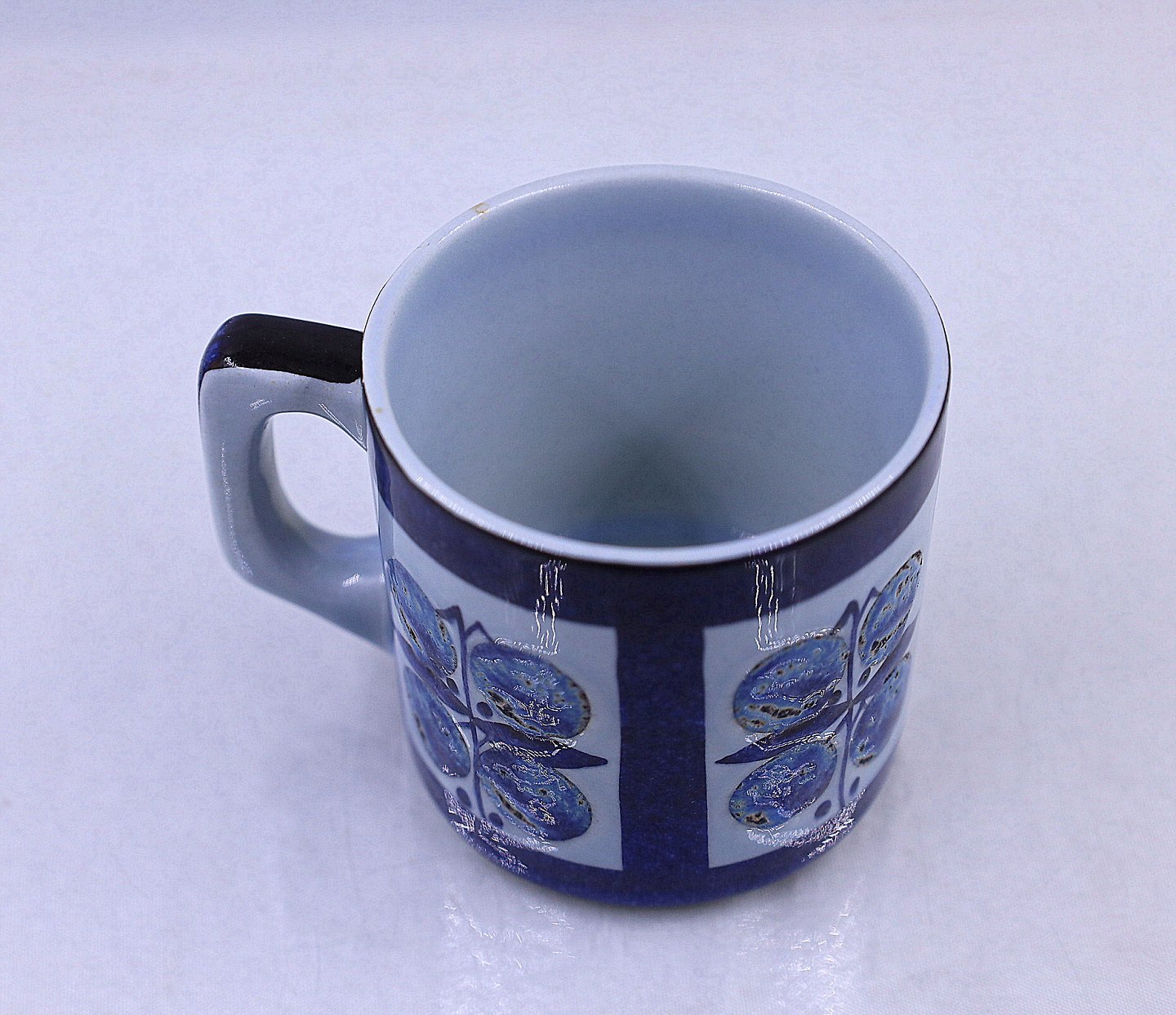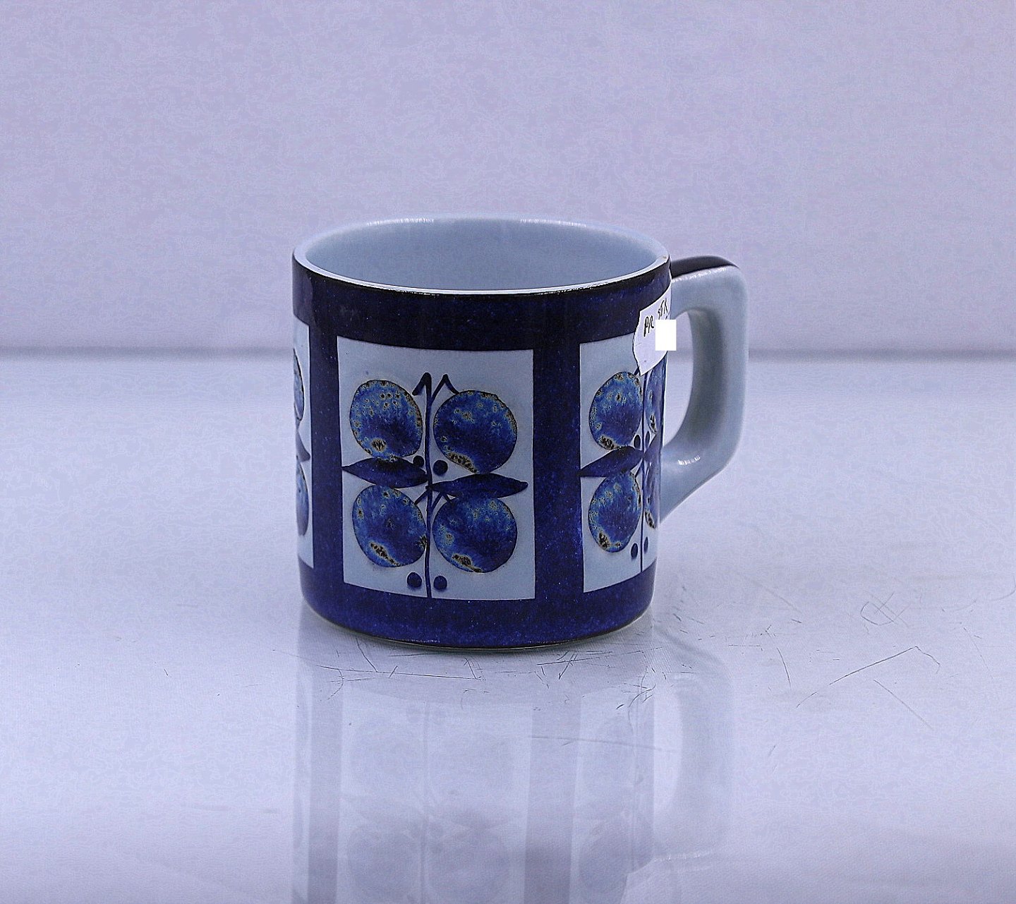 Aluminia, Royal Copenhagen. Krus, special udgave, nr. 447/2068. Dette er et lille krus, dekorationen er 4 blålige æbler, sat i firkant.