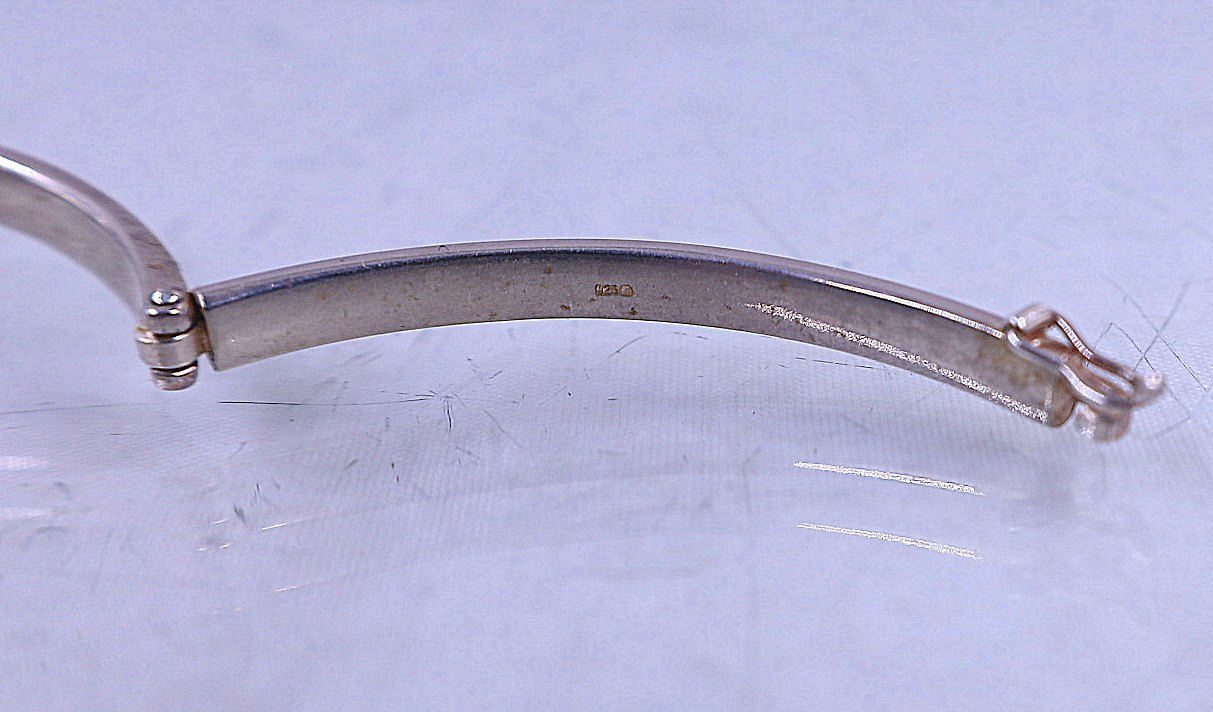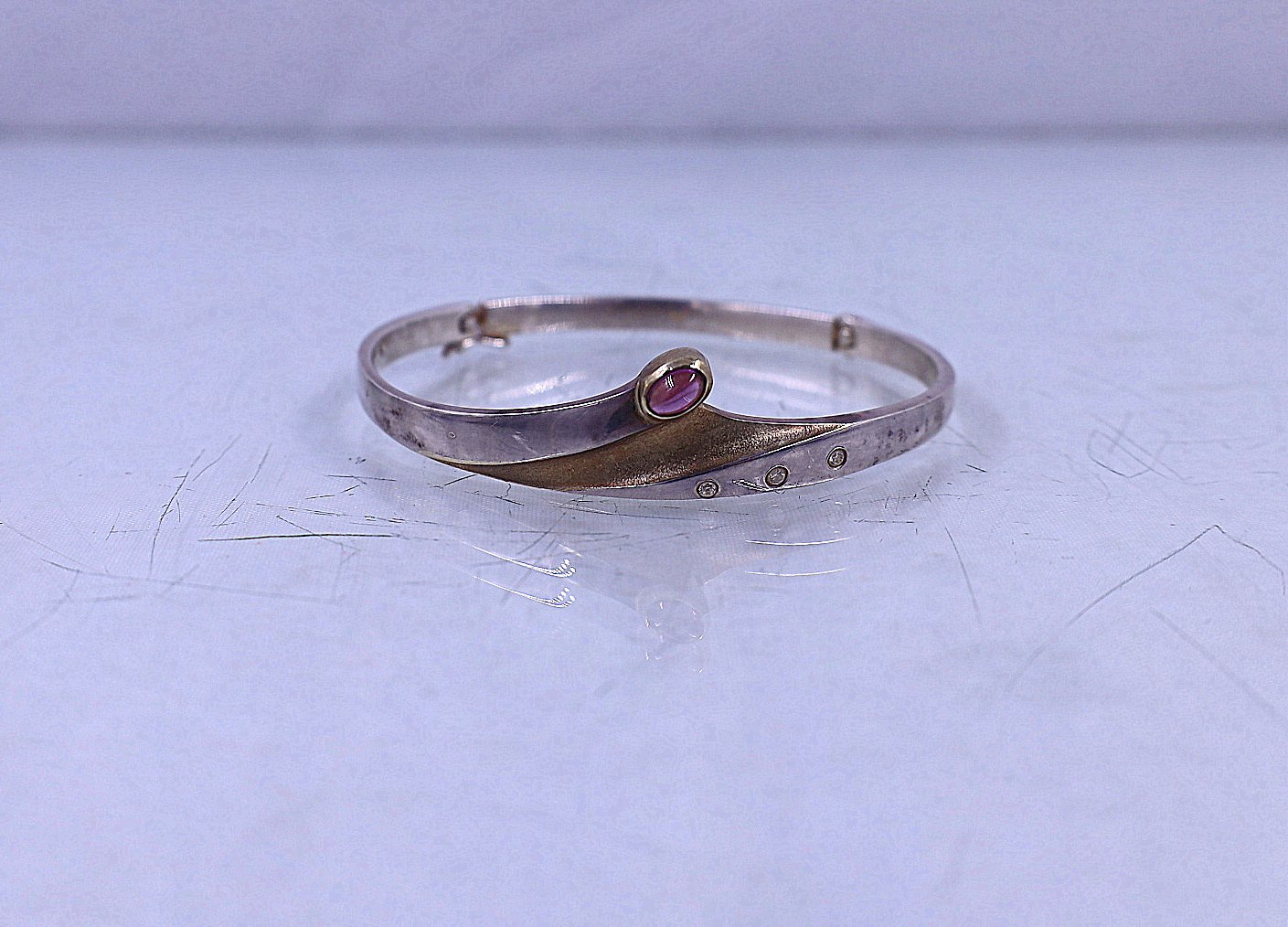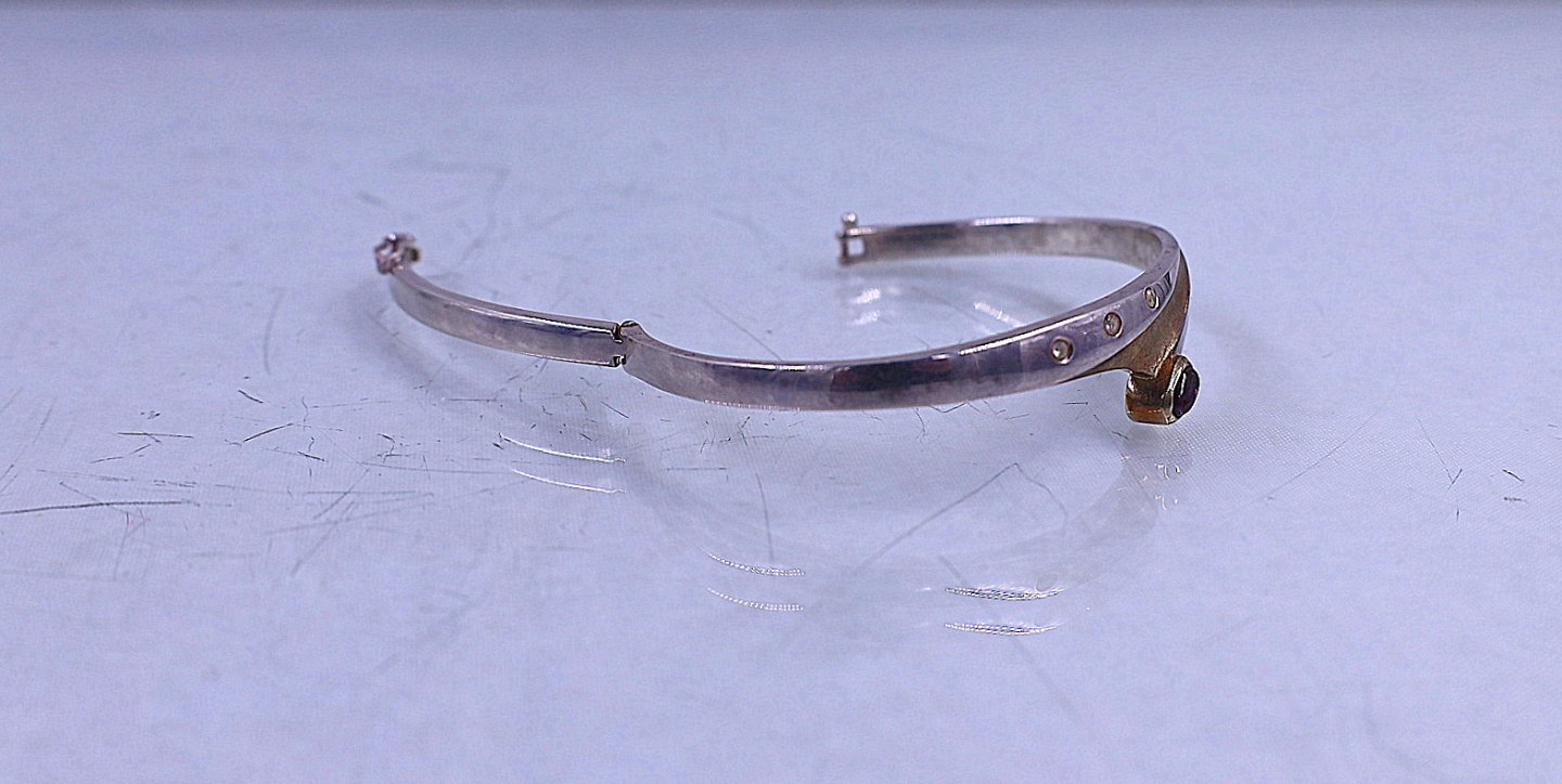 Armring med indlagt guld, 3 klare sten og en lilla sten. Armringen er lukket med sikkerhedslås. 925s sølv. Brugt, men i god stand