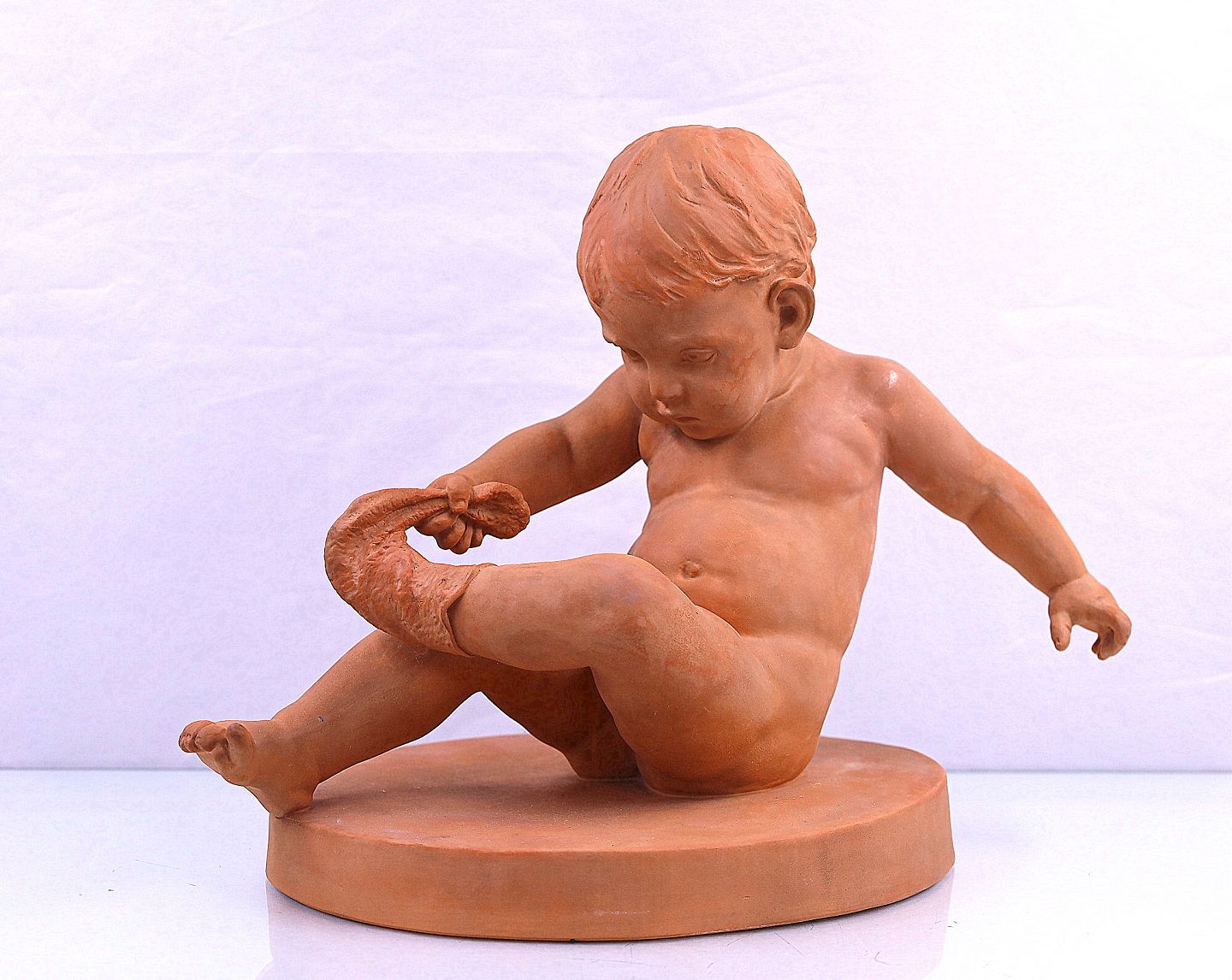 P. Ipsen. Strømpedrengen nr. 347. Figuren er fremstillet af terrakotta og ikke glaseret. Strømpedrengen er formodentlig fremstillet efter Peter Ipsens død.