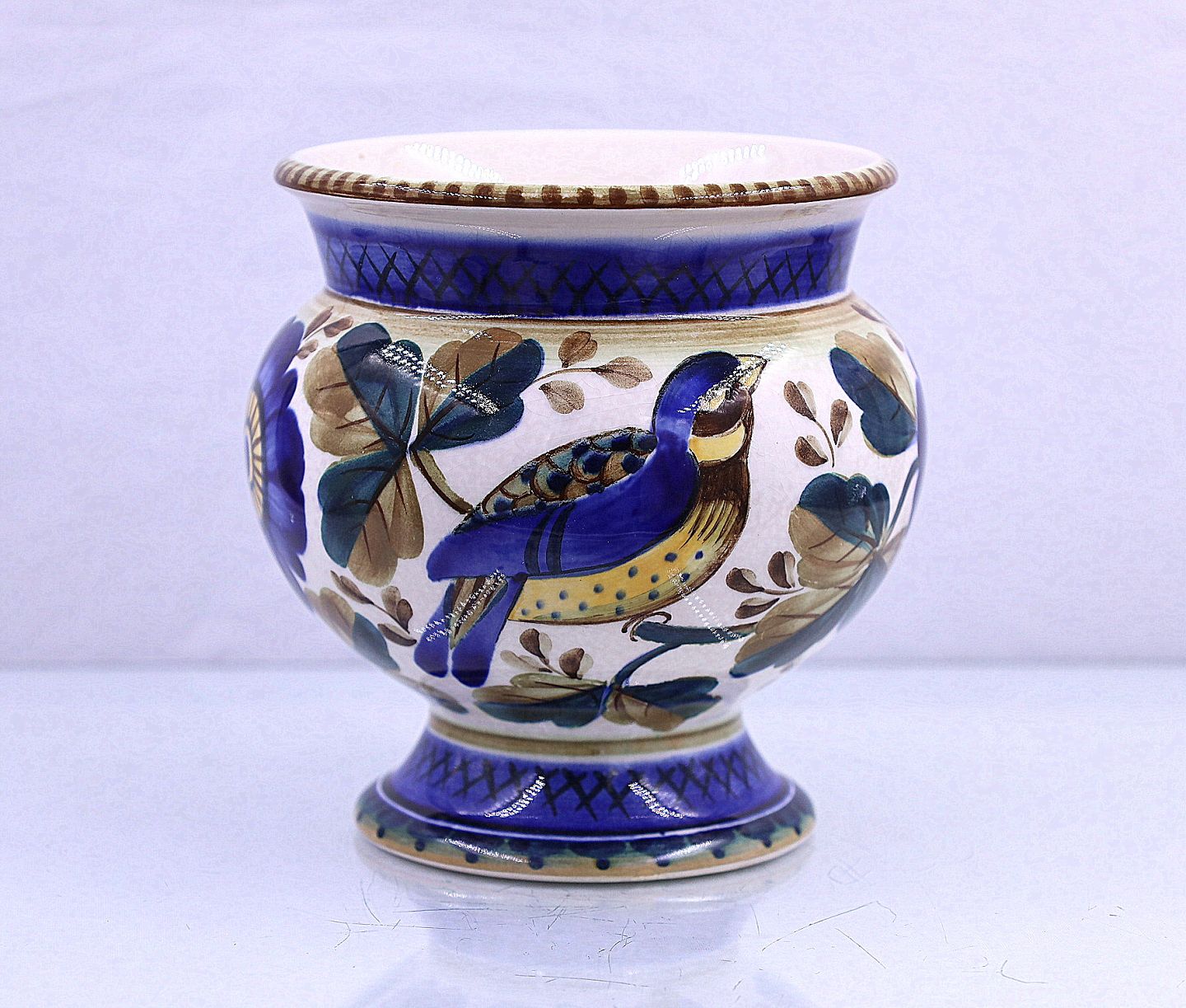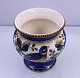 Aluminia, fajance, potteskjuler nr. 1289. Potten er dekoreret med blå fugle, blå blomster og blå/grønne blade.