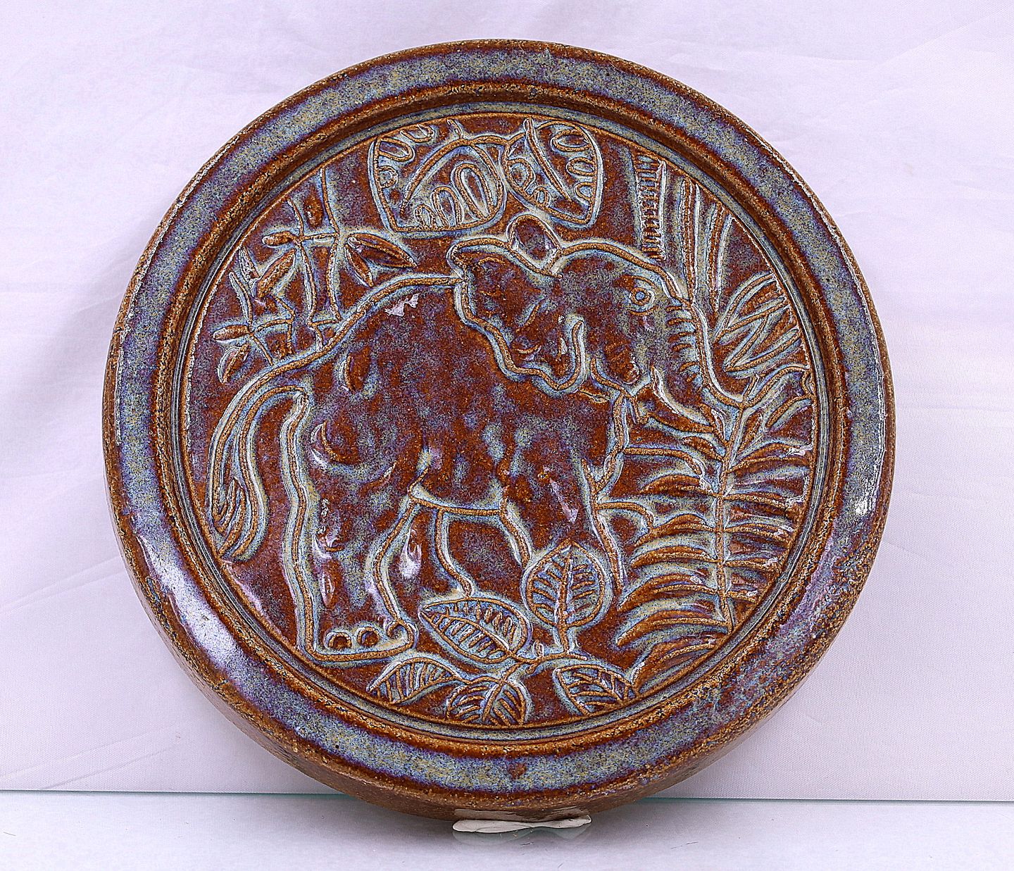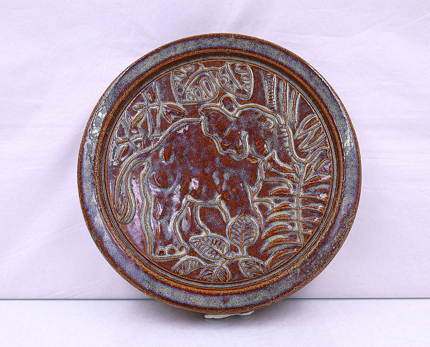 Søholm Keramik. Rundt relief med elefant, der går i græs og blade, relieffet er glaseret brunligt.