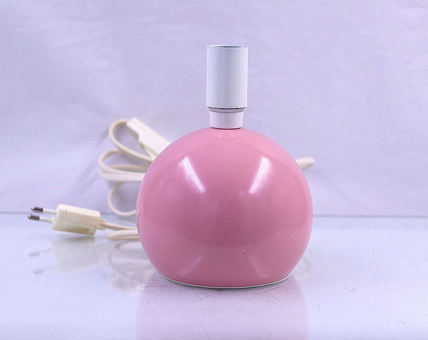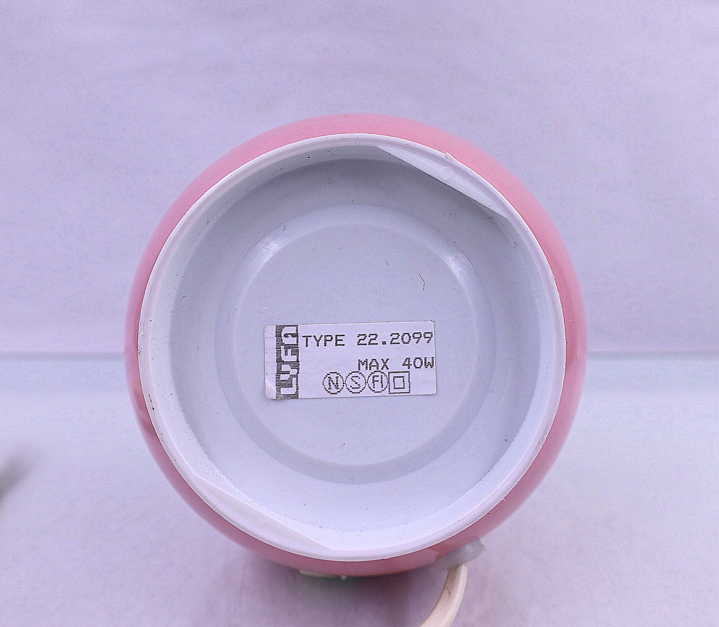 Bordlampen er lyserød, bunden er af plastik og kan tages ud.