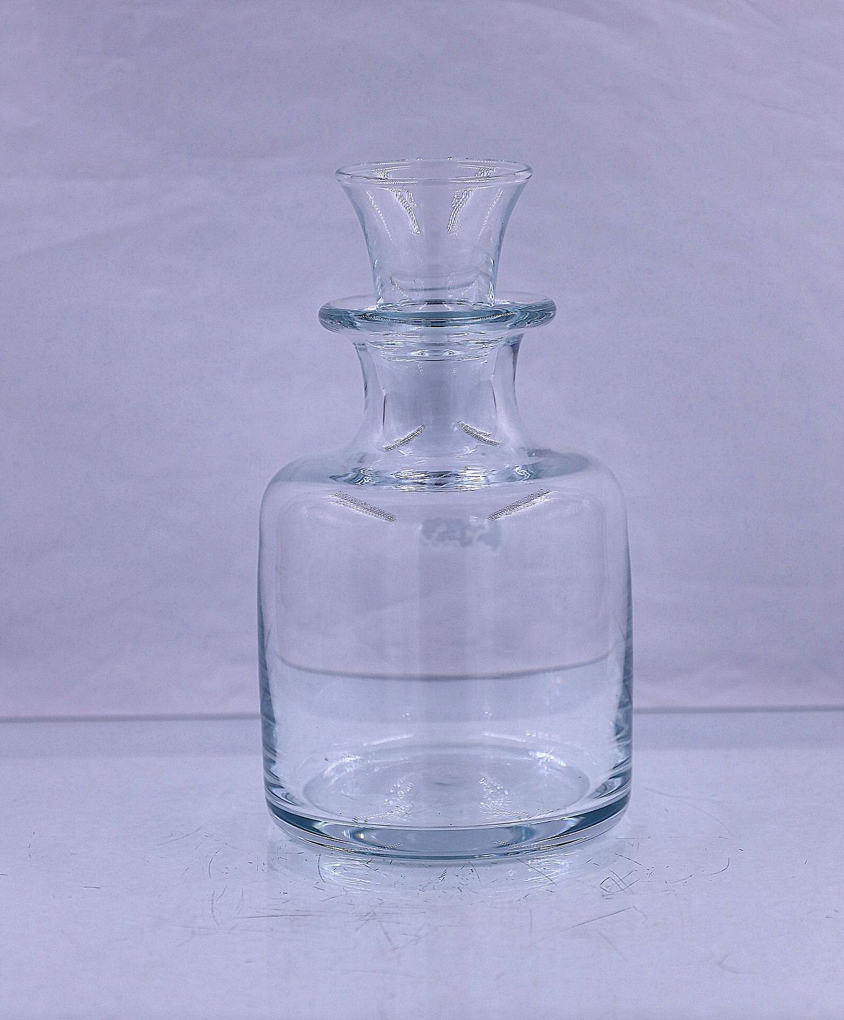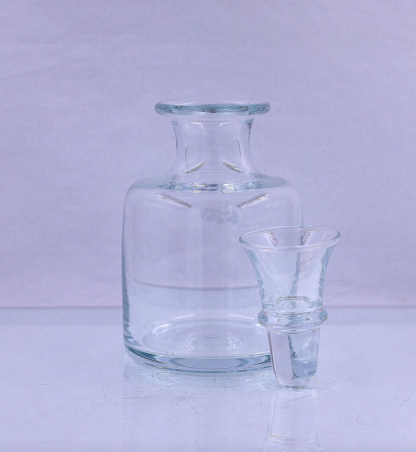 Holmegaard Glasværk. Lav karaffel , medtilhørende prop, formet som drikkeglas. Glasset bliver også kaldet "Morgenlærke". Karaflen, der er fra serien "Snapsedoktoren, er lav og rund, med et godt greb i alle situationer.