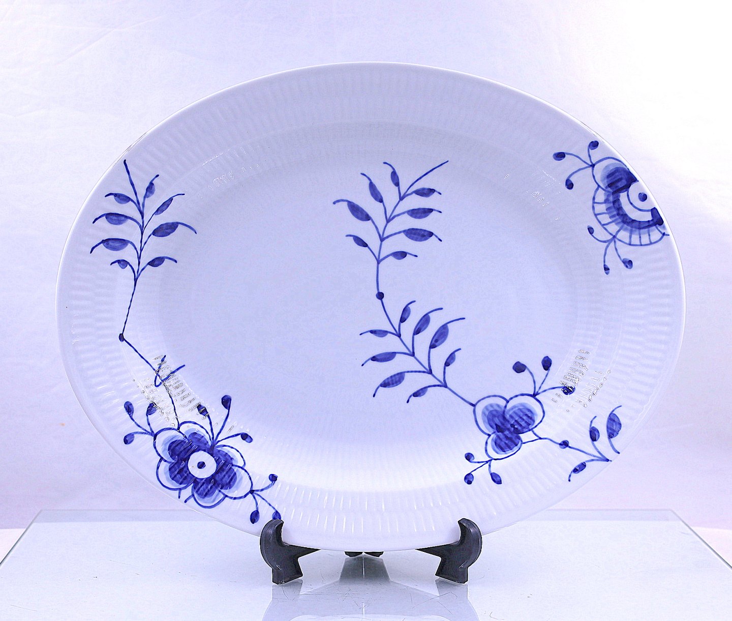 Royal Copenhagen. Mega musselmalet ovalt serveringsfad nr. 375. Mega musselmalet er i de klassiske hvide og blå farver. Blåt mega riflet