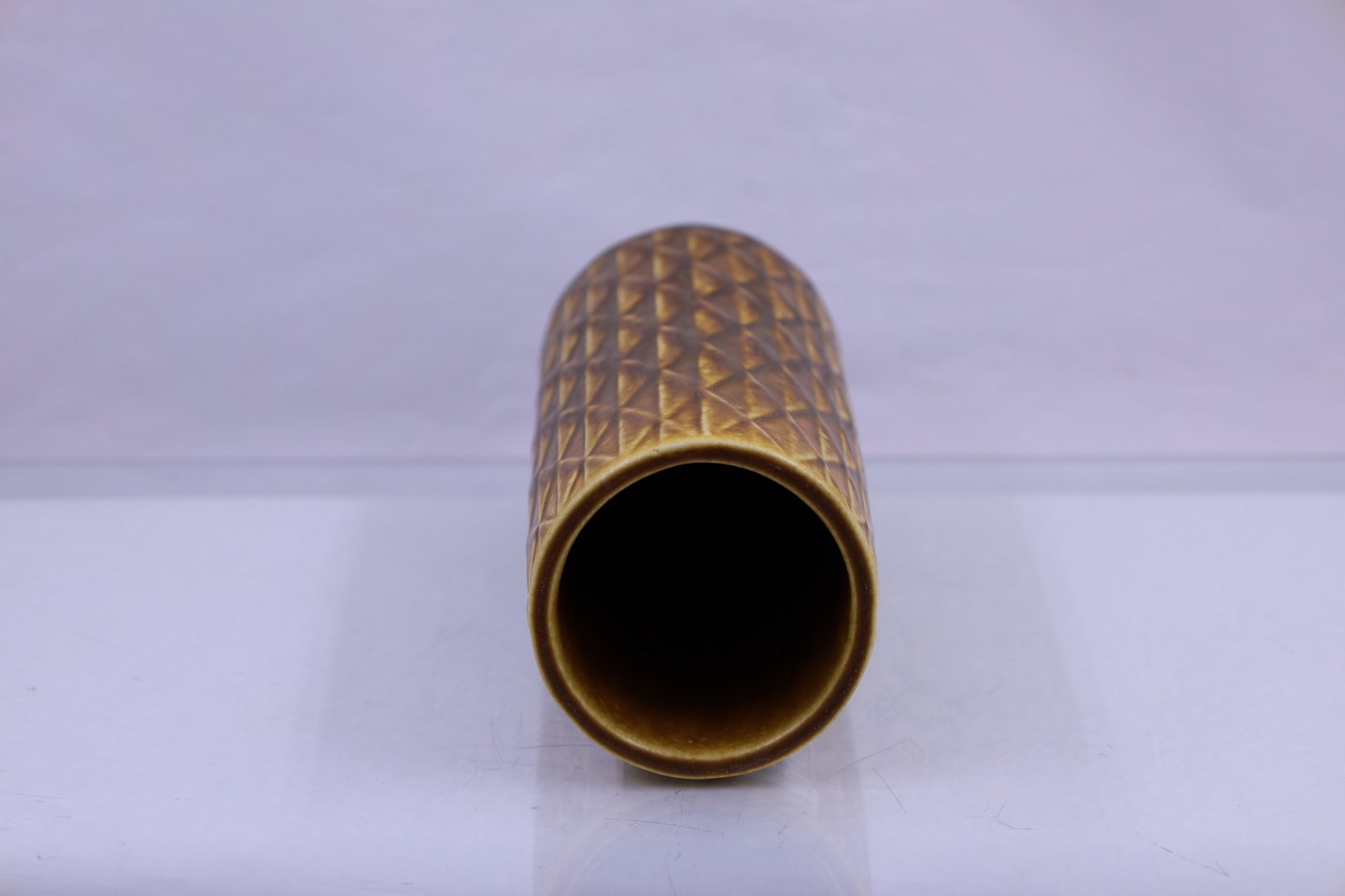 Rørstrand, Sweden. Gunnar Nylund. Eterna vase, nr.5. Cylindrisk keramik vase med geometrisk mønster i brunlige farver. Vasen er signeret G.N., Sweden