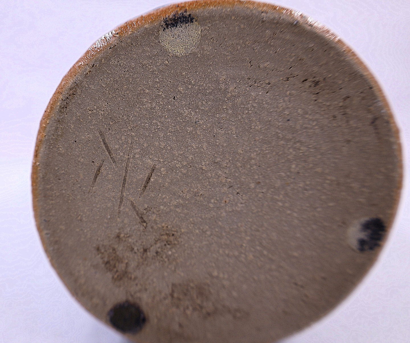 TK-Keramik vase. Cylinderformet vase, vasen er glaseret blå med brun og hvid kant. Vasen er brun indvendig.