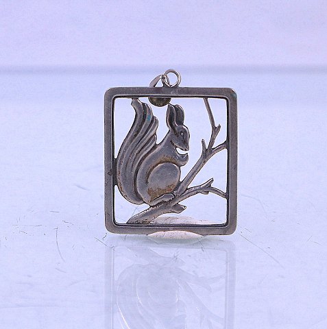 Ib Jensen. Firkantet sølv vedhæng, med egern der sidder på en gren. Vedhænget er stemplet "IB J 830S"