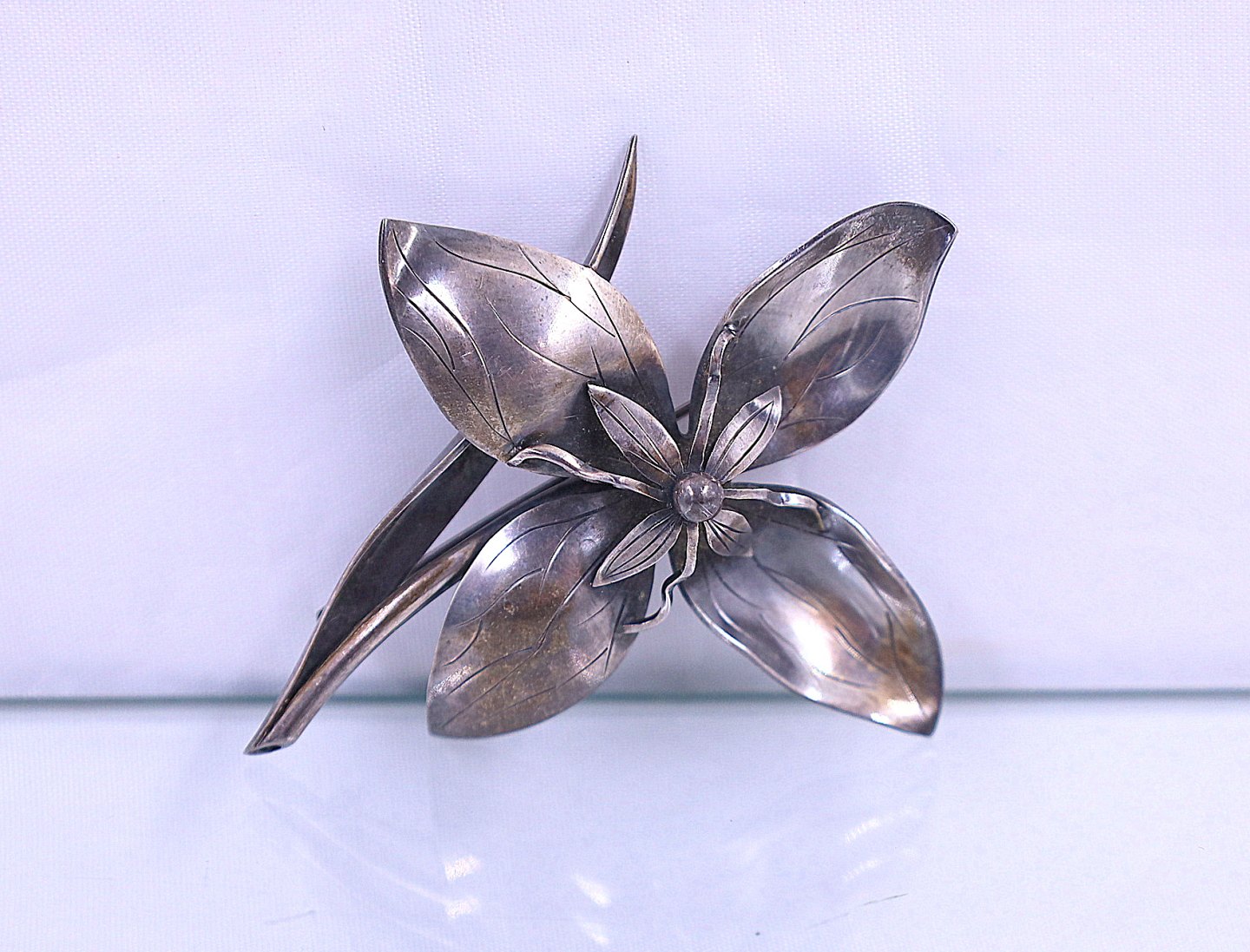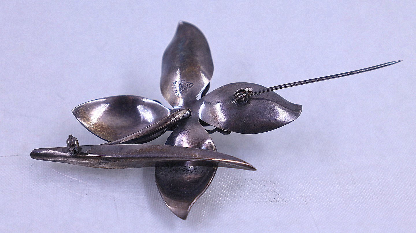 Anton Michelsen. Skønvirke broche i sølv. Broche i form af blomst med stilk og blad. Stemplet AM Sterling/Denmark