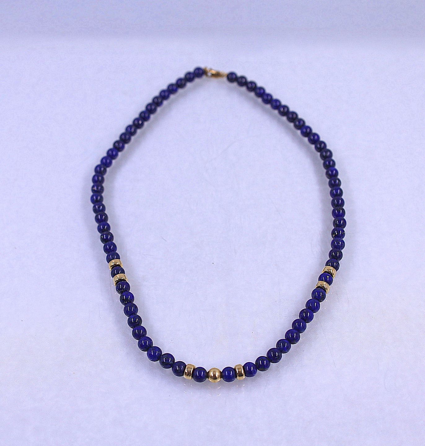 Halskæde, der består af perler i blåsafir og 14 karat guldperler, halskæden er lukket med fjederlås.