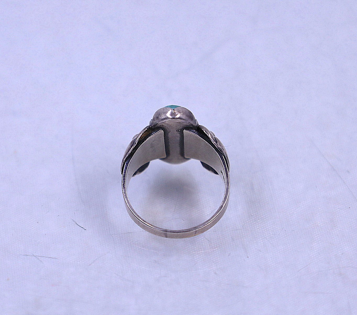 Hugo Grün. Skønvirke sølvring, 830s, med indfattet Malakit på frontpladen, indfatningen skal forestille blade.