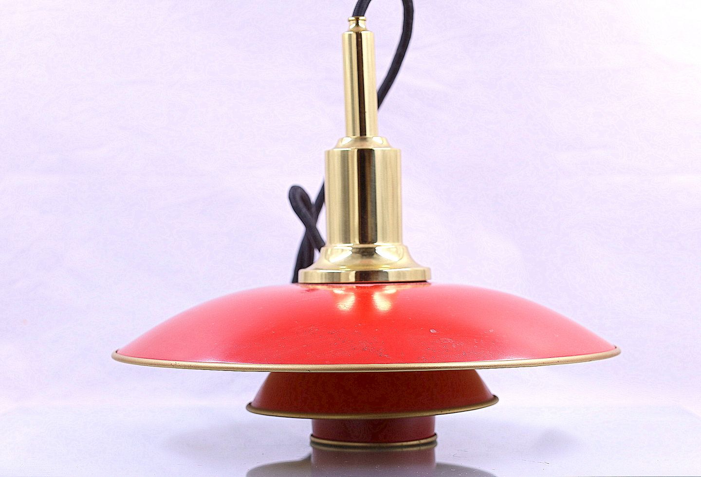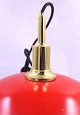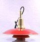 Denne pendel er rødlakeret, udvendig og indvendig er pendlen lakeret mat guld, ophænget er messing. Pendlen kommer med sort stofledning.