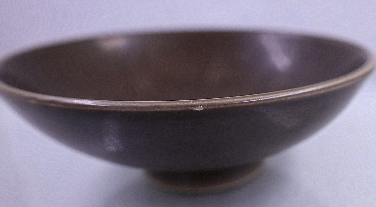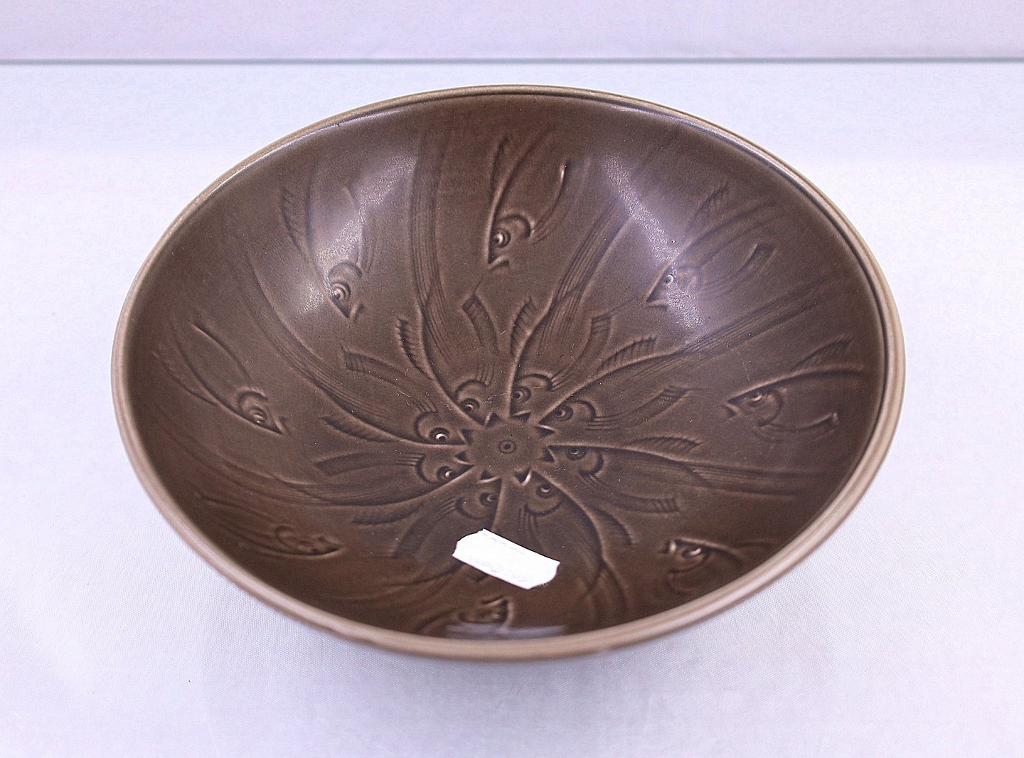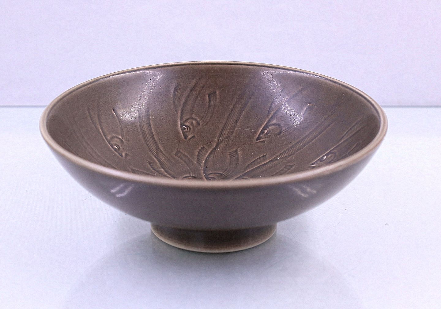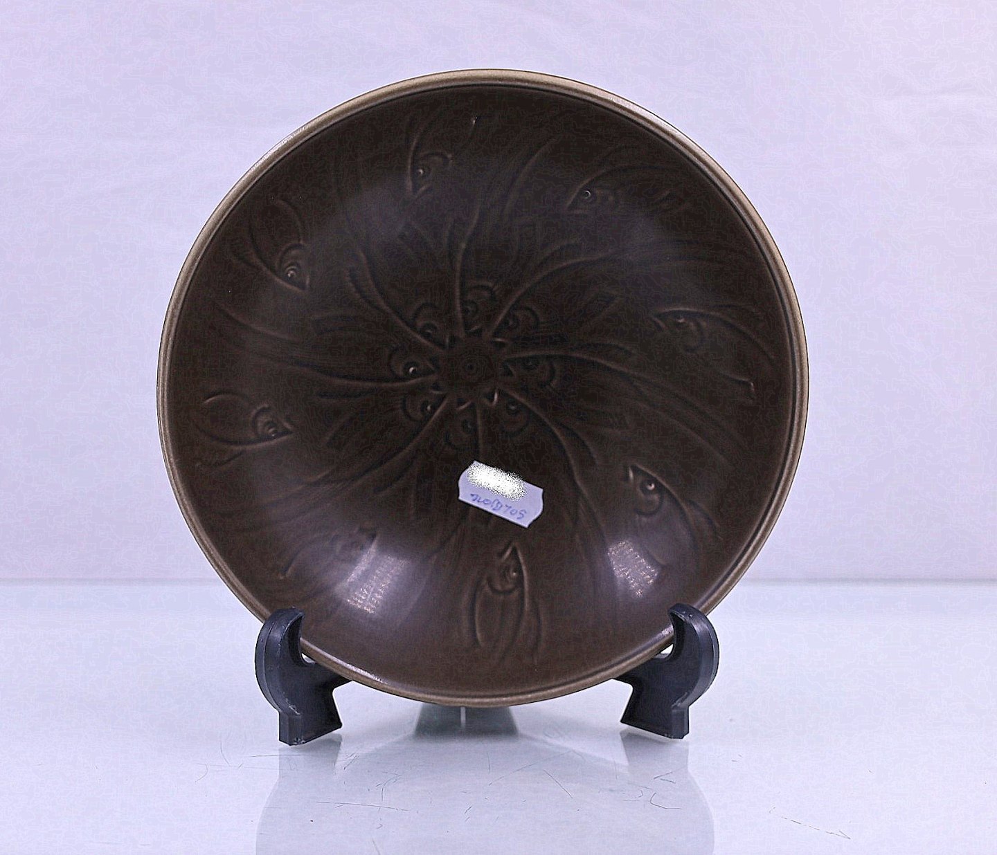Aluminia. Skål, Solbjerg 1585. Chokoladebrun skål på fod, skålen er dekoreret med fisk i relief.