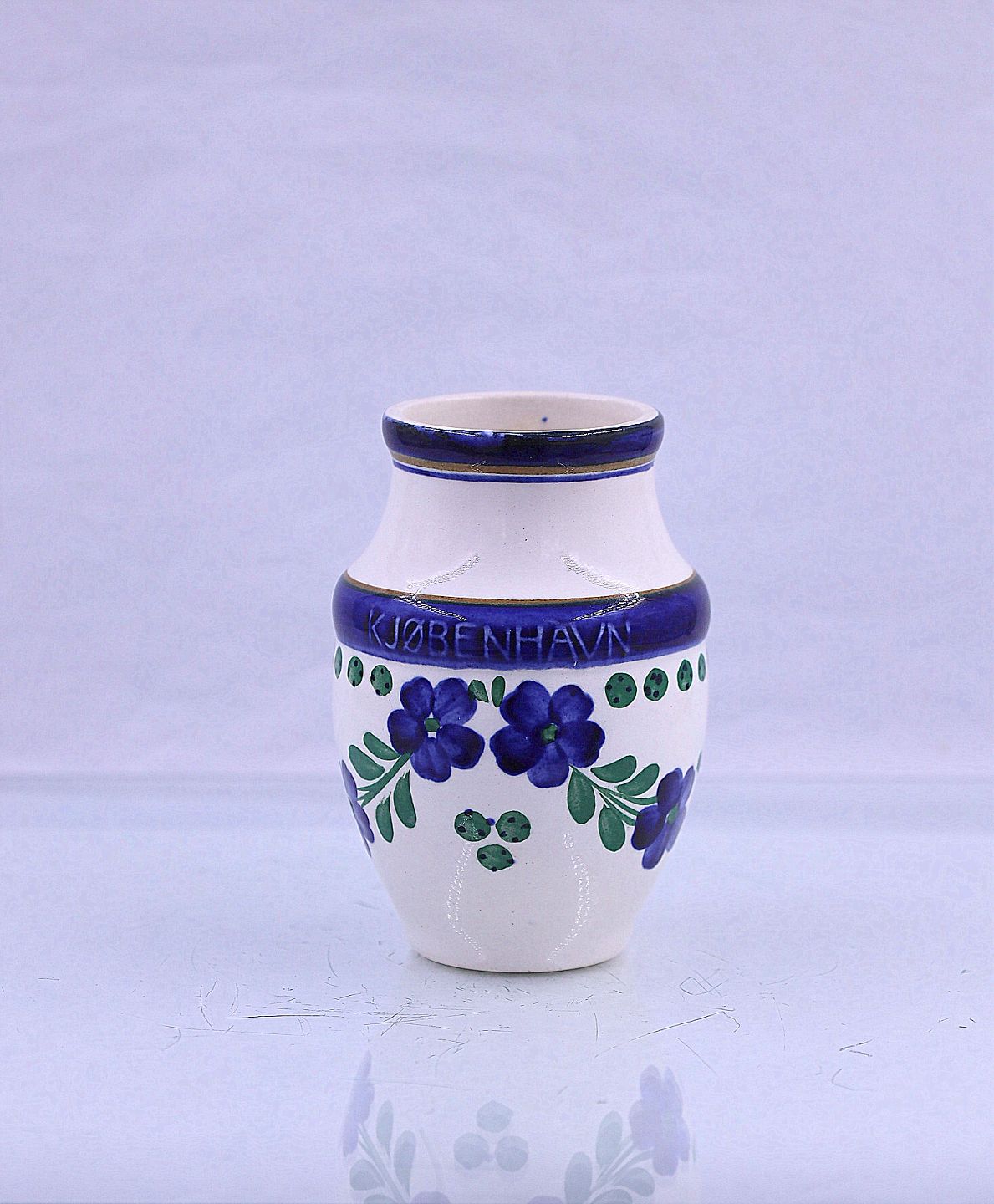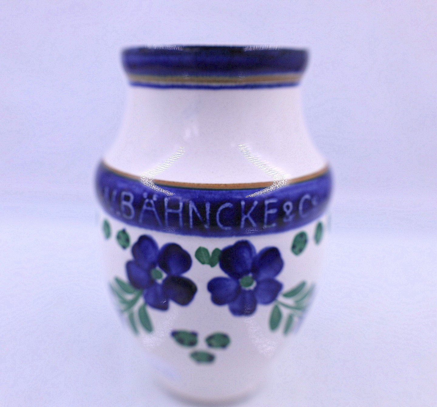 Aluminia. Fajance flaske, blå blomster og grønne blade. Den har indskriften KJØBENHAVN, W. BÄHNCKE & Co. Der er ikke stempelet.
