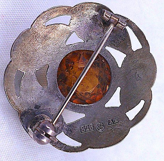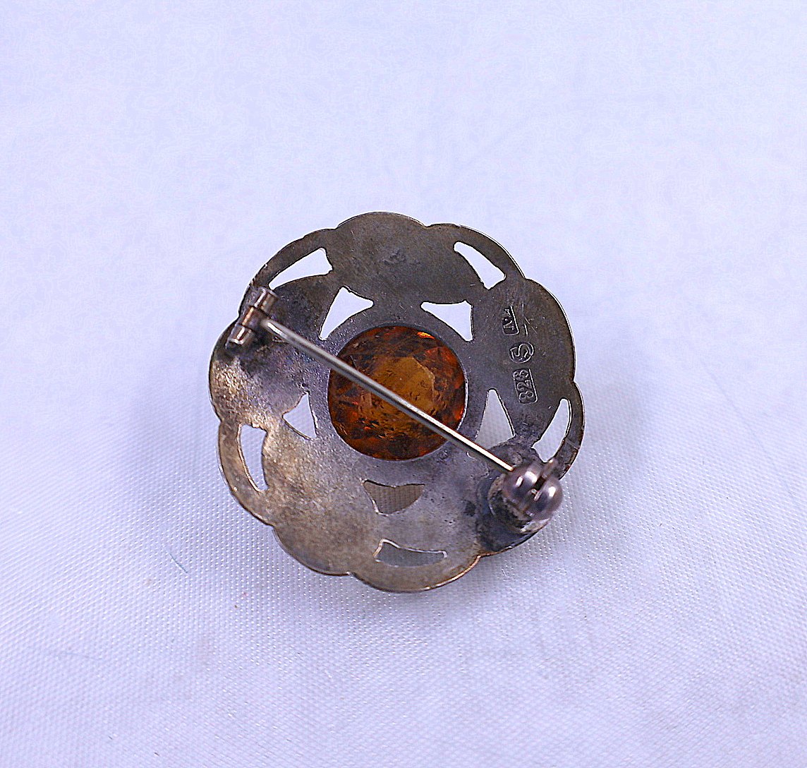 Sølvsmed August Ehlers Rund sølv broche, 826S, med ciseleringer i bladene. Der er en facet slebet glas sten i midten af brochen.