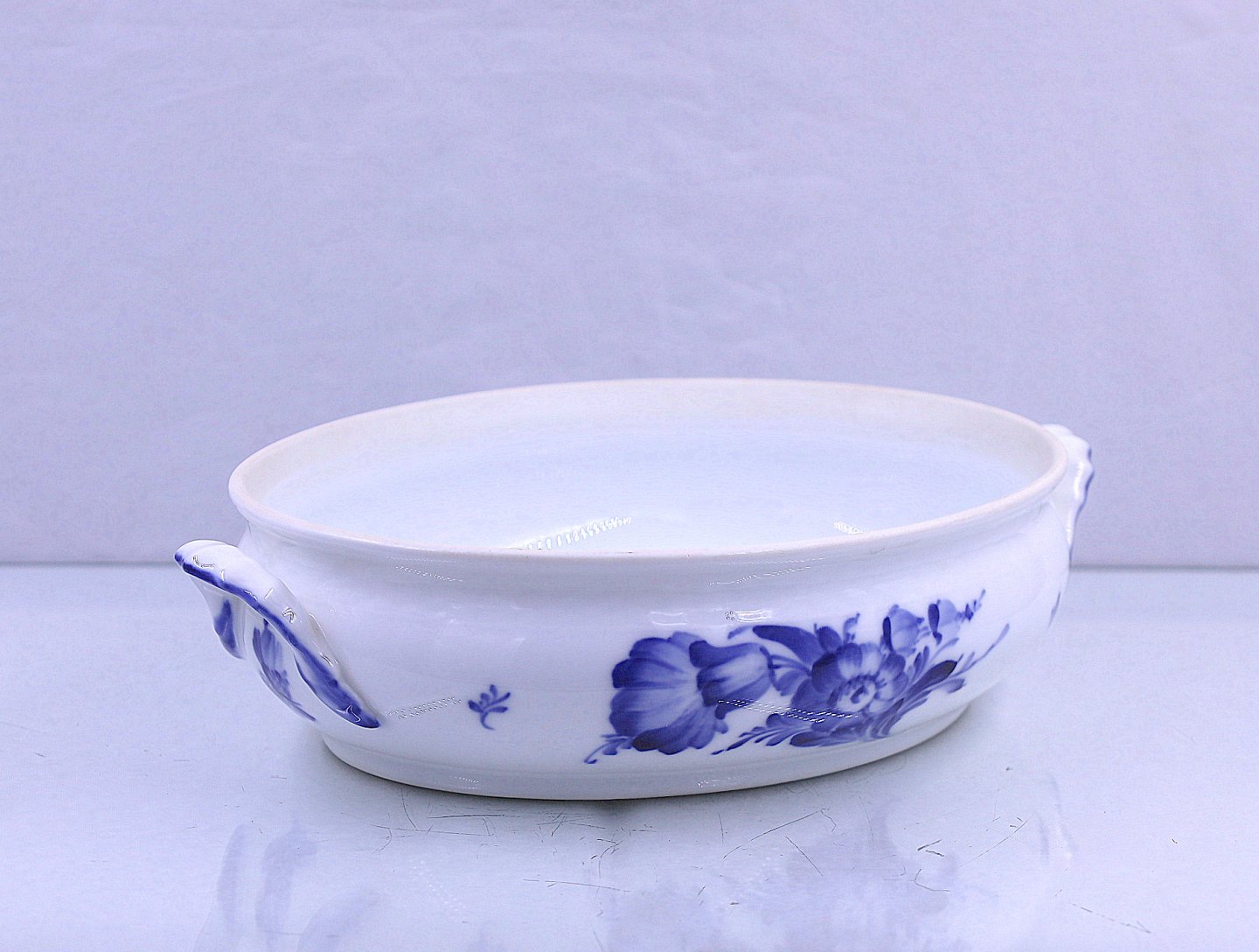Royal Copenhagen. Blå Blomst, flettet. Ovalt lågfad Nr. 10/8054. Fad og låg har samme nr. Blå blomst hører til rækken af hvid og blå porcelæn Royal Copenhagen har lavet