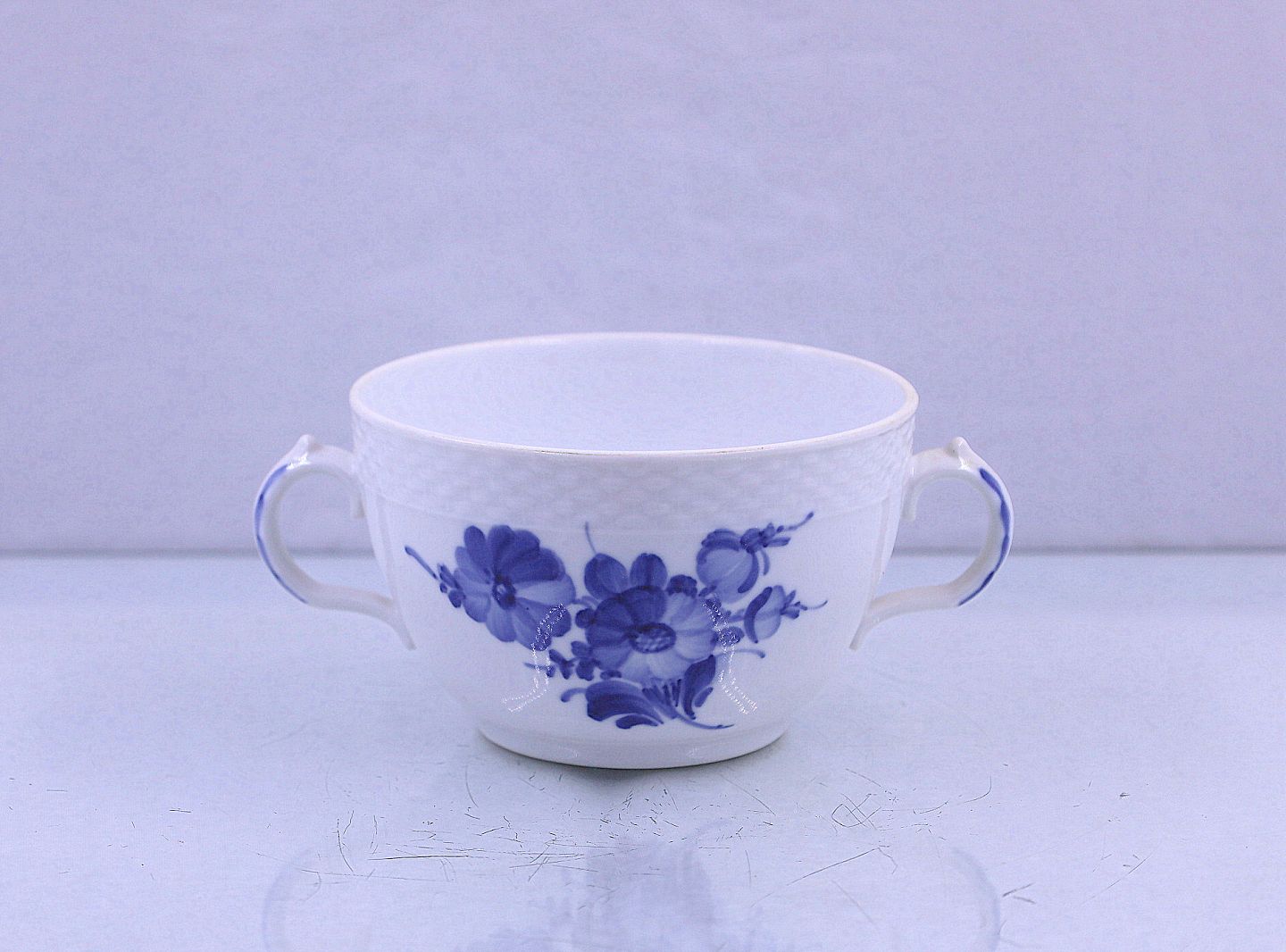 Royal Copenhagen Boullion Kop, nr. 10/8142, flettet kant og 2 hanke. Blå blomst hører til rækken af hvid og blå porcelæn Royal Copenhagen har lavet. Vi har også låg, der kan tilkøbes.